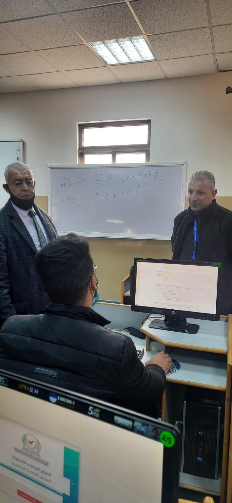 ورافق عميد الكلية الاستاذ الدكتور جاسر عنانزه نائب العميد والدكتور ايمن فريحات مساعد العميد لشؤون التخطيط والتطوير والجودة والمهندس محمد انجادات رئيس قسم الحاسوب منسق التعليم الالكتروني والامتحانات المحوسبه والدكتور خالد الربابعه رئيس قسم التخطيط والتطوير والجودة.