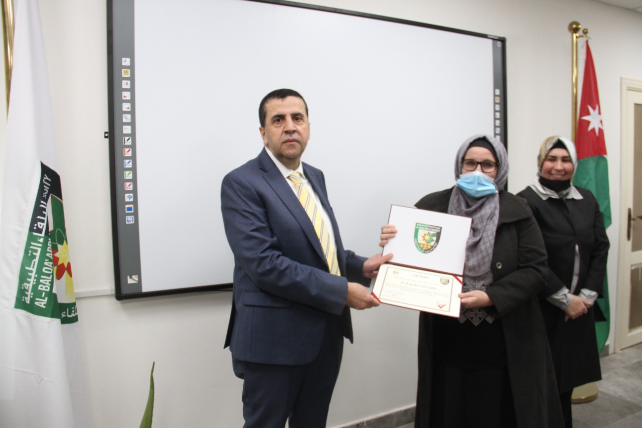 وعلى هامش اللقاء كرم الدكتور العجلوني الدكتوره شرف عمر من كلية الزراعه تقديرا لها على ابحاثها المتميزة، والموظفين في الكلية المهندسة روان ابو طالب والسيد ثامر ابو مان لتميزههم في العمل في الكلية.