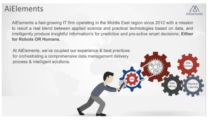 ويذكر أن شركة AiElements تعمل على توظيف تقنيات الذكاء الاصطناعي لتطوير عمل المؤسسات وذلك بتوحيد الإحصاء، وتحليل البيانات وتعلم الآلة والوسائل والتقنيات المرتبطة بها من أجل فهم وتحليل البيانات الخاصة.