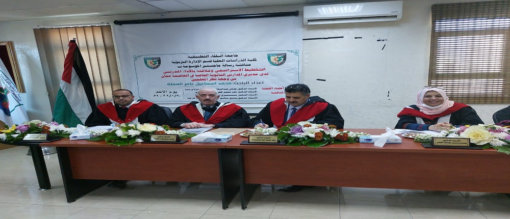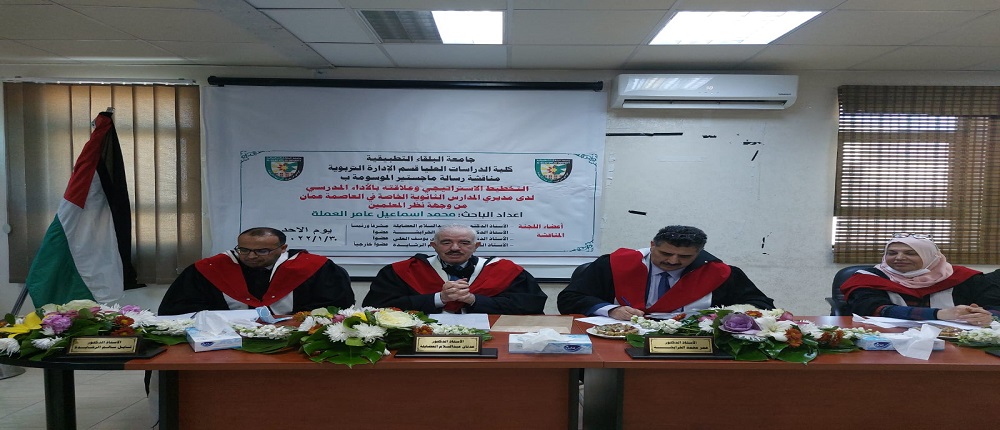 تم في مساء يوم الأحد  الموافق 30/1/2022 ، مناقشة رسالة ماجستير للطالب محمد اسماعيل عامر العملة تخصص الادارة التربوية ،  قسم العلوم التربوية بعنوان (التخطيط الاستراتيجي وعلاقته بالأداء المدرسي لدى مديري المدارس الثانوية الخاصة في العاصمة عمان من وجهة نظر المعلمين)