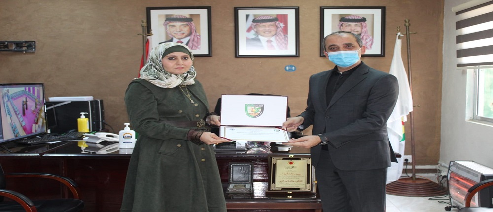 عميد كلية الاميرة رحمة الجامعية يسلم شهادة الموظف المثالي لشهر كانون الثاني للزميلة آيات علي الزعبي