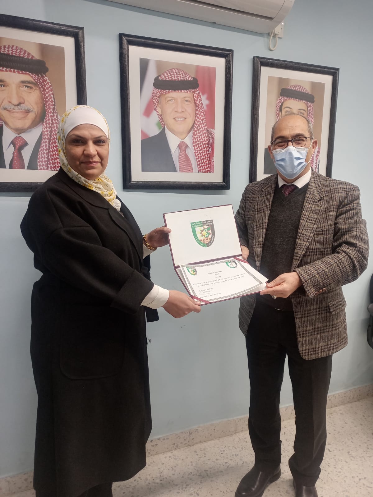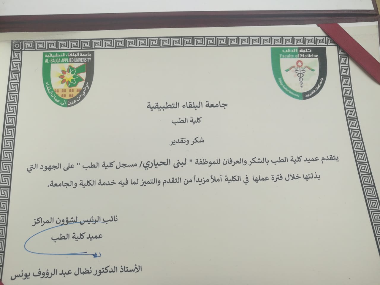 شهادة شكر وتقدير لموظفة التسجيل في كلية الطب لبنى الحياري.