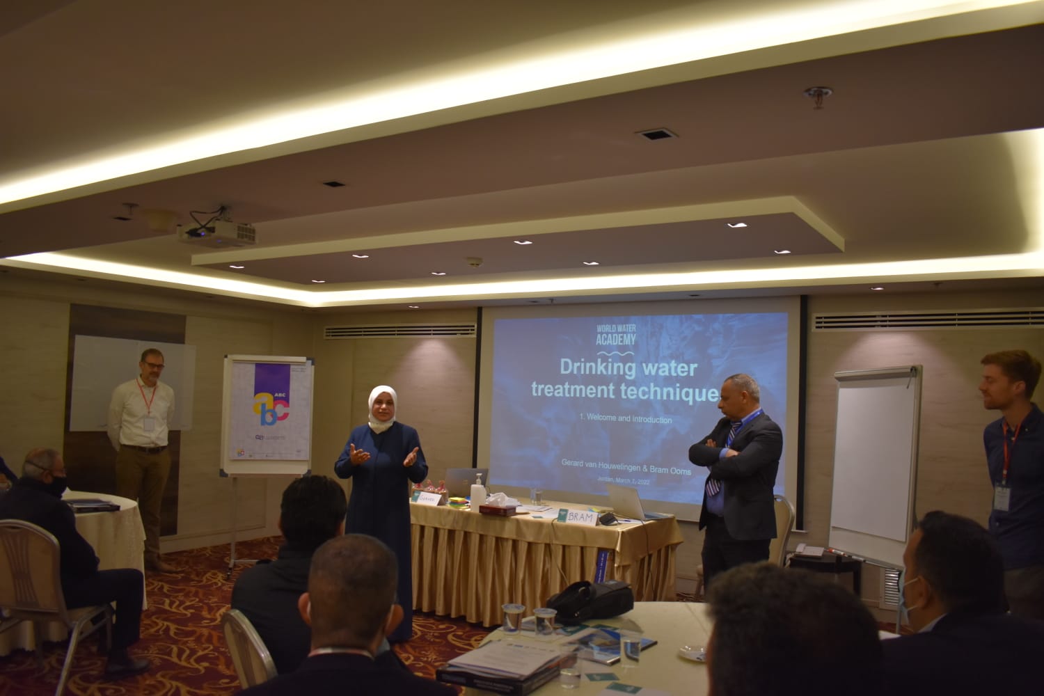 تم تنفيذ البرنامج التدريبي وجاهيا بواسطة السيد جيرارد فان هوولينجن والسيد برام أوومس المستشارين في أكاديمية العالم للمياه ومركزها مملكة هولندا والدكتور ناصر المناصير الخبير في مجال المياه والبيئة والتغير المناخي من جامعة البلقاء التطبيقية، ولمدة أربعة أيام (7 –10/3/ 202) تم خلالها تعزيز المعرفة والمهارات الفنية للمتدربين والتعرف على التقنيات الحديثة في مجال معالجة مياه الشرب. كما وركز البرنامج التدريبي على النواحي الأبتكارية في معالجة مصادر المياه بأقل كمية من الطاقة والانبعاثات وذلك للحد من الغازات الدفيئة وبالتالي من التغير المناخي الأمرالذي ينسجم مع السياسة الوطنية للتكيف مع التغير المناخي ويحقق أهداف خطة عمل المركز الدولي لبحوث المياه والبيئة والطاقة للتغير المناخي.