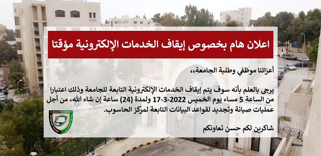 يرجى بالعلم بأنه سوف يتم إيقاف الخدمات الإلكترونية التابعة للجامعة وذلك اعتبارا من الساعة 5 مساء يوم الخميس 17-3-2022 ولمدة 24 ساعة إن شاء الله، من أجل عمليات صيانة وتجديد لقواعد البيانات التابعة لمركز الحاسوب.