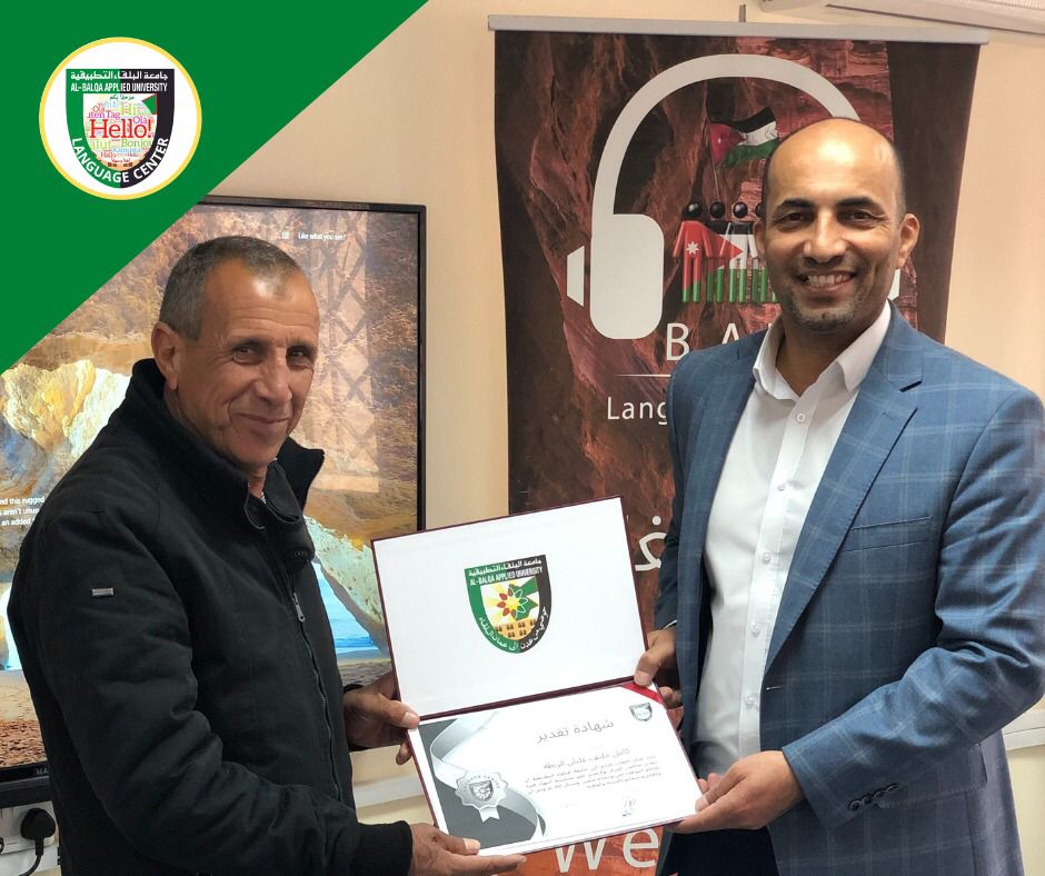 كرّم مدير مركز اللغات الدكتور ناجي القبيلات، السيد كامل خليف الربطة موظف الأمن والحماية المتقاعد؛ لانتهاء فترة خدمته في المركز، حيث تم تقديم شهادة تقدير للموظف المتقاعد؛ للتعبير عن الشكر على الجهد الذي بذله خلال فترة خدمته، التي تميزت بالإخلاص والالتزام، وحضر التكريم الزملاء الموظفون في مركز اللغات، الذين قدّموا بدورهم الشكر والدعاء من الله تعالى أن يُمتّعه بموفور الصحة والعافية.