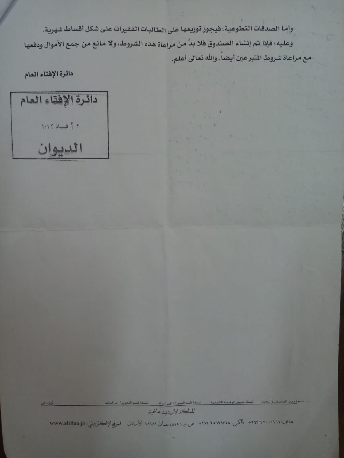 وأشار الدكتور العجلوني الى فتوى دائرة الإفتاء العام في المملكة الأردنية الهاشمية حول حكم جمع الزكاة والصدقات التطوعية لصالح صندوق الطالبة المحتاجة لمساعدتهن على في الإنفاق على حاجاتهن الشخصية والتي أكدت بدورها على جواز دفع الزكاة والصدقات لهذا الصندوق حسب الفتوى المرفقة.