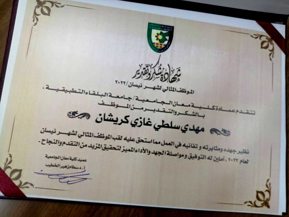 انسجاماً مع توجهات رئاسة جامعة البلقاء التطبيقيّة في تحسين الأداء الوظيفي وتطويره، وتحفيز قيم التنافس البنّاء في العمل لدى الموظفين، سلم عميد كلية معان الجامعيّة الأستاذ الدكتور سطّام زهير الخطيب شهادة الموظف المثالي (شهادة تقديرية) عن شهر نيسان 2022م للموظف مهدي سلطي كريشان / قسم الخدمات، بحضور نائب العميد ومساعديه ورؤساء الأقسام.