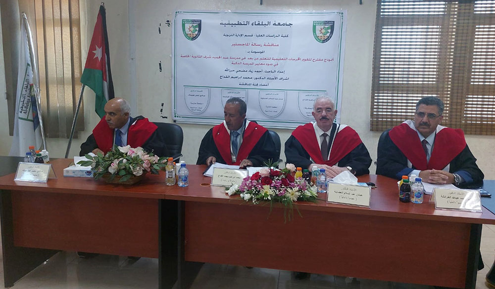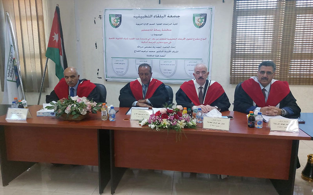تم صباح يوم الثلاثاء الموافق 24/5/2022 مناقشة رسالة ماجستير للطالب أحمد زياد مضحي حرزالله تخصص الإدارة التربوية قسم العلوم الإدارية بعنوان : (أنموذج مقترح لتقويم المخرجات التعليمية للتعلم عن بعد في مدرسة عبدالحميد شرف الثانوية الخاصة في ضوء معايير المدرسة الذكية)