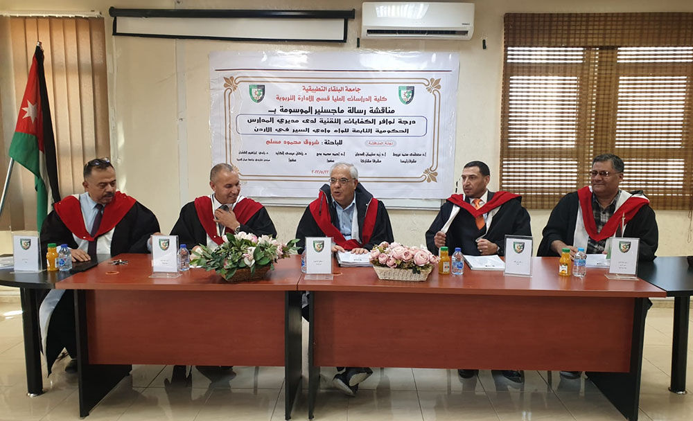 تم في صباح يوم الأحد الموافق 22/5/2022 ، مناقشة رسالة ماجستير للطالبة شروق محمود مسلم تخصص الإدارة التربوية ، قسم العلوم التربوية بعنوان ( درجة توافر الكفايات التقنية لدى مديري المدارس الحكومية التابعة للواء وادي السير في الأردن)