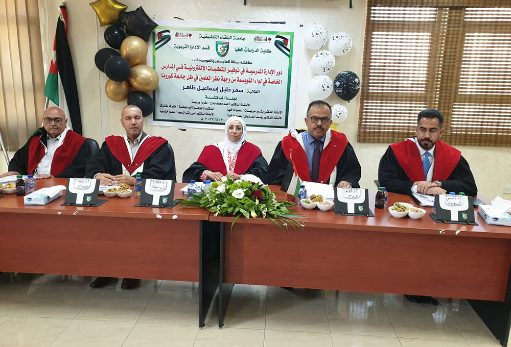 تم مساء يوم الإثنين الموافق 30/5/2022 ،مناقشة رسالة ماجستير للطالبة سمر خليل إسماعيل ظاهر برنامج ماجستير الإدارة التربوية قسم العلوم التربوية والموسوم ب: