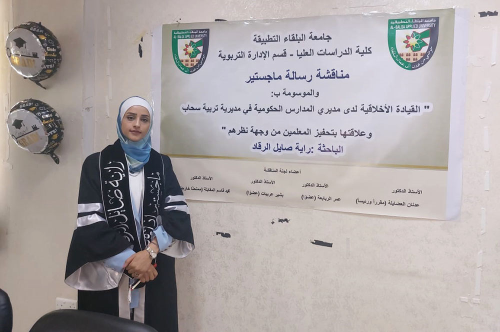 تم مساء يوم الخميس الموافق 2/6/2022 ،مناقشة رسالة ماجستير للطالبة راية صايل خالد الرقاد برنامج ماجستير الإدارة التربوية قسم العلوم التربوية بعنوان :