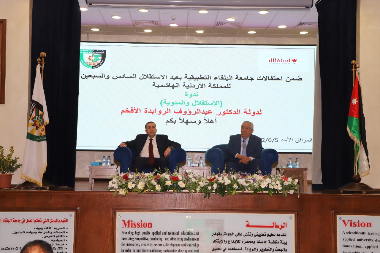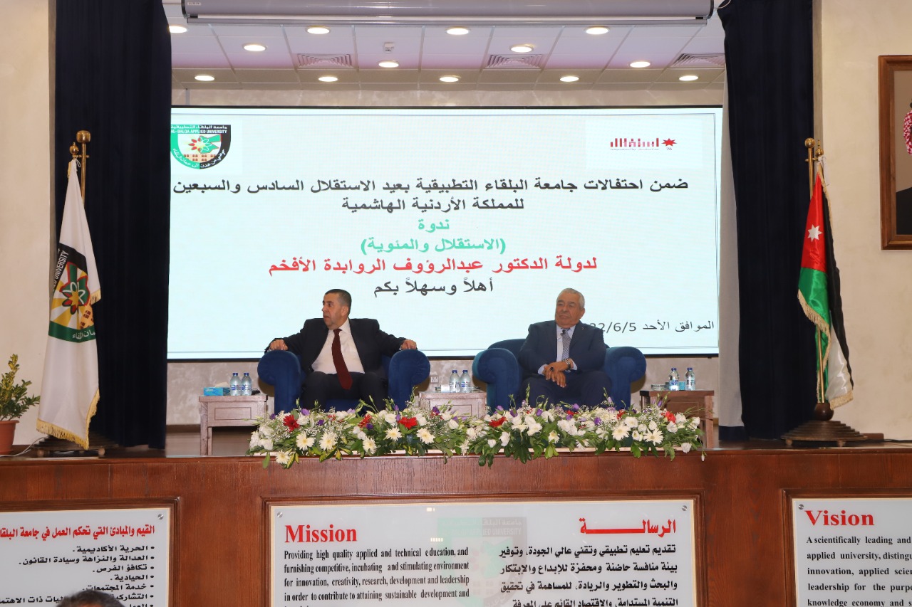 بدوره رئيس جامعة البلقاء التطبيقية الاستاذ الدكتور احمد فخري العجلوني قال "ان الاستقلال بكل ما يحمله من دلالات ومعاني الشرف والرجولة والكرامة والكبرياء لا بد ان يكون محطة نقف عندها في كل عام نستلهم من عبقها العزم والحزم على المضي دوما في طريق البناء والتقدم والتطور .