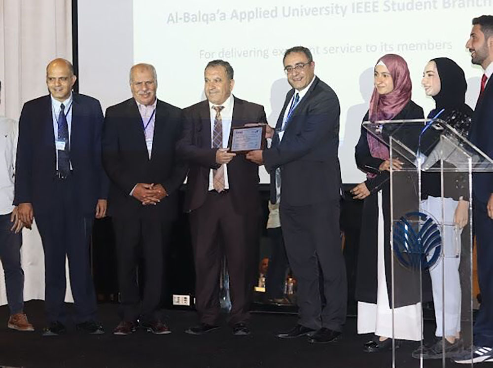 سلم رئيس فرع منظمة IEEE في الأردن الدكتور علاء خليفة الجائزة الدولية التي قدمتها المنظمة العالمية لمهندسي الالكترونيات والكهرباء حول العالم IEEE لمندوب رئيس جامعة البلقاء التطبيقية الأستاذ الدكتور احمد فخري العجلوني لفوز الفرع الطلابي في جامعة البلقاء التطبيقية بجائزة الفرع الطلابي الأفضل على مستوى المنطقة الثامنة التي تشمل أوروبا و الشرق الأوسط و شمال أفريقيا (IEEE Region 8)حيث قام مندوب رئيس الجامعة نائب الرئيس للشؤون الأكاديمية الأستاذ الدكتور زكريا القضاه بتسليم الجائزة للفرع الطلابي خلال انعقاد الحفل السنوي لمجمع المهندسين الكهربائيين والإلكترونيين (IEEE) فرع الأردن في فندق روتانا و بحضور عميد كلية الهندسة التكنولوجية الدكتور احمد عواد و المشرف العام للفرع الطلابي IEEE في جامعة البلقاء التطبيقية الدكتور اوس القيسي.