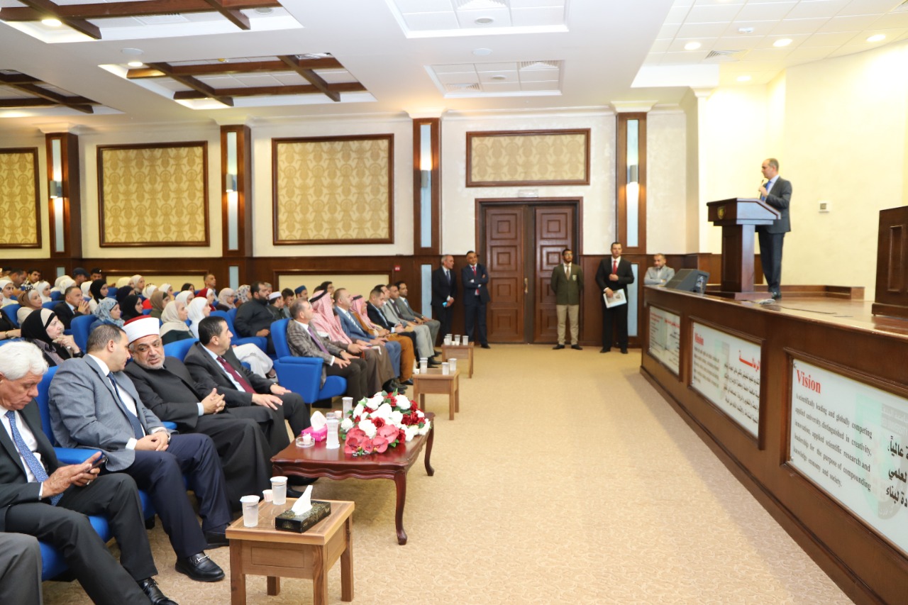 بدوره شكر عميد شؤون الطلبة الدكتور خالد الزعبي بإسم رئيس وأسرة الجامعة وزير الأوقاف والشؤون والمقدسات الإسلامية على التكرم برعايته لهذا الإحتفال وقال بأن سيدنا محمدعليه الصلاة والسلام جاء ليعيد للبشرية رشدها وأن يجعل أولى أولوياته إعادة ايمان الانسان بإنسانيته بعد ان كانت البشرية تعبد الأصنام وتشرك بالله فقد جاء برسالة عالمية تنكر سفك الدماء وتحرم الفساد في الأرض ، وأضاف الدكتور الزعبي أنه لو قُدر لنا ان نطوي الأربعة عشر قرناً وان نجمع ما قيل في حق سيدنا محمد عليه الصلاة والسلام في السيرة وما كتب من نثر وشعر ومدائح وما ذكره الذاكرون وتناوله الدارسون لما وصلنا لقطرة من بحر النبي عليه الصلاة والسلام ، كما أننا اليوم أحوج ما نكون الى إتباع الفضائل التي غرسها سيدنا محمد في الأمة ودعا إليها .
