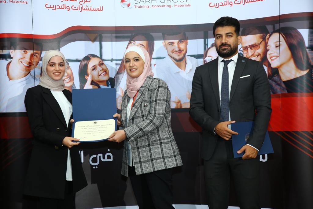 حصل أوائل قسم المحاسبة في كلية الأعمال- جامعة البلقاء التطبيقية في برنامج البكالوريوس على (10) منح لعام (2022/2023) للحصول على شهادة المحاسب الإداري المعتمد  (CMA) ، وتصل قيمة المنحة المالية الواحدة مبلغ (2,000) دولار، وقد تم توزيع المنح في حفل أقيم في فندق الريجينسي بتنظيم من مؤسسة صرح الجمان وبدعم من شركة هوك إنترناشونال (Hock International) ومعهد (IMA) وجمعية المحاسبين الإداريين الأردنيين (JAMA).
