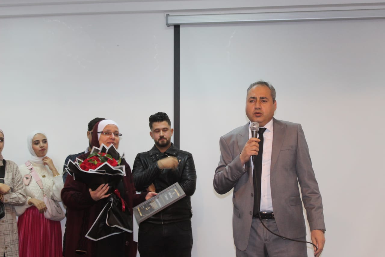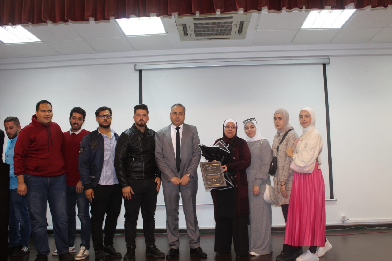 في نهاية الحفل سلم عميد الكلية شهادة شكر  وتقدير   للدكتورة خيرية شنيكات مساعد العميد للشؤون الطلابية مقدمة من طلبة الكلية.