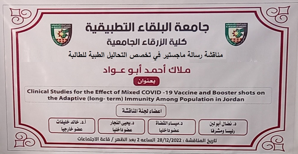 ضمن الإجراءات الأكاديمية المعتمدة في كلية الزرقاء الجامعية/ جامعة البلقاء التطبيقية للحصول على شهادة الماجستير تم يوم الأربعاء الموافق 28/12/2022 مناقشة رسالة ماجستير في تخصص التحاليل الطبية ، والتي تقدمت بها الطالبة: ملاك أحمد أبو عواد بعنوان:
