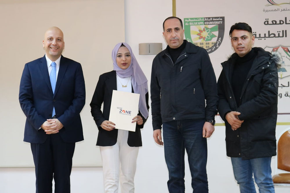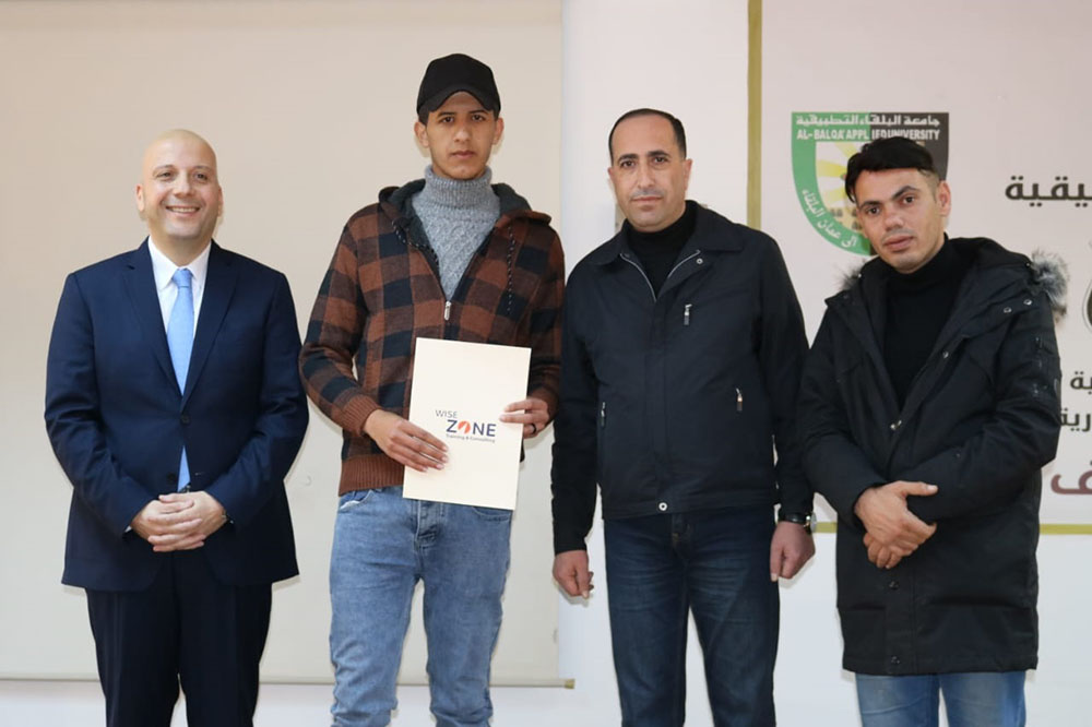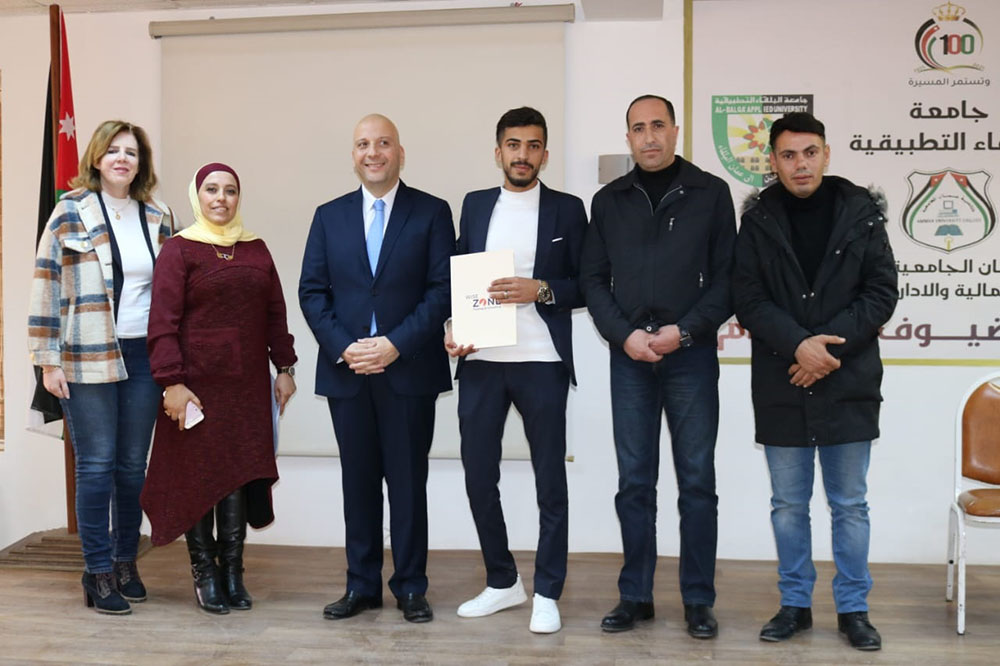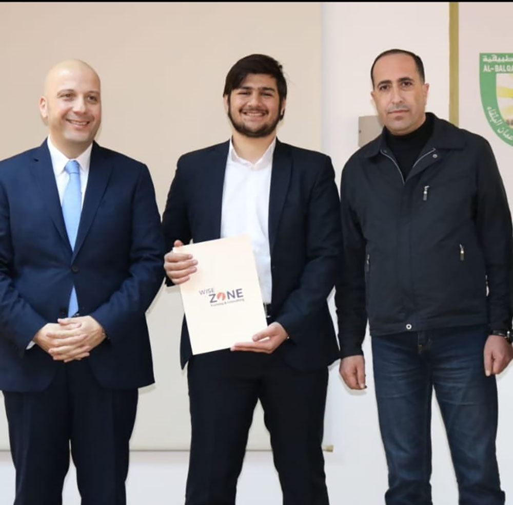 مندوباً عن عميد كلية عمان الجامعية الأستاذ الدكتور مروان النسور قام نائب العميد للدراسات العليا الدكتور خالد أبو ريشة بتسليم طلاب الدعم اللوجستي شهادات عن الدورة المعنونة بمهارات التوظيف بالتنسيق مع السيدة منتهى بدارنه رئيس شعبة التخطيط والتطوير والتي تم عقدها بحرم الكلية لمدة أربع أيام بواقع ?? ساعة وبالتعاون مع شركة WISE ZONE والوكالة الالمانية GIZ