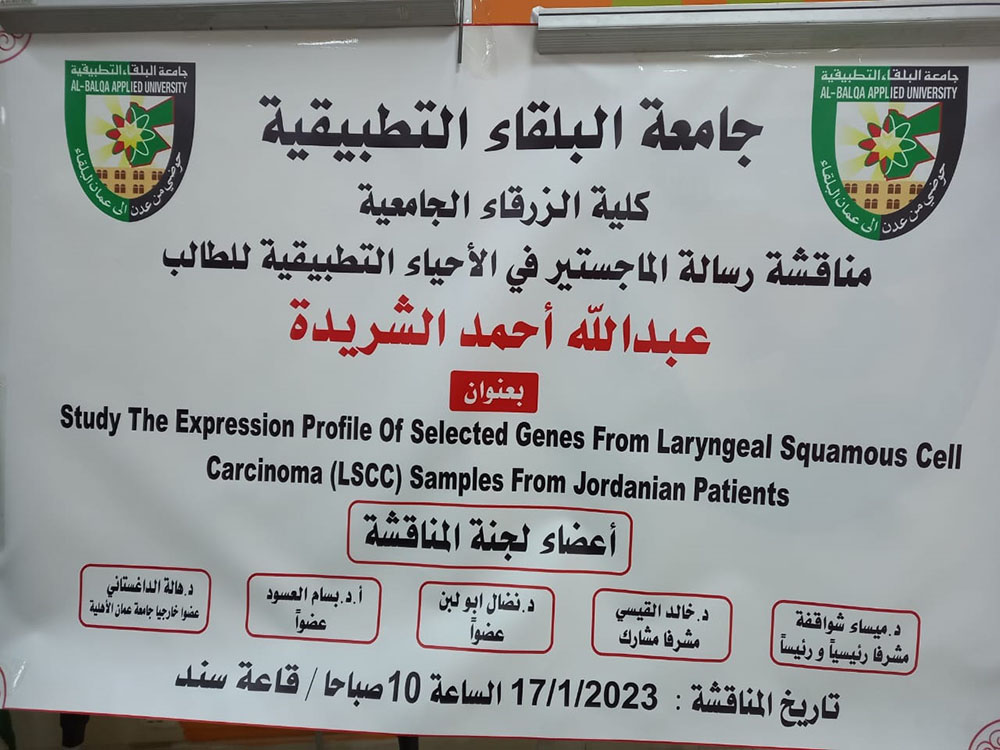 كلية الزرقاء الجامعية تناقش رسالة ماجستير في تخصص الأحياء التطبيقية للطالب عبدالله أحمد الشريدة