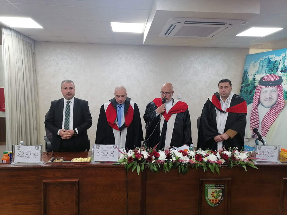 و تشكلت لجنة المناقشة برئاسة وأشراف محمد حسن حمادات من كليةعجلون الجامعية والاستاذ الدكتورعمرالربابعة مناقشاً داخلياً / كلية عجلون الجامعية و الدكتور أيمن فريحات مناقشاً داخلياً / كلية عجلون الجامعية والدكتور أحمد ربيع مناقشا خارجيا /جامعة جرش الأهلية .