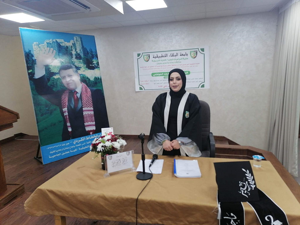 كما وتم مناقشة رسالة ماجستير للطالبة الباحثة رنيم محمد المومني في قاعة الشهيد محمد العزام كلية عجلون الجامعية /جامعة البلقاء التطبيقية بعنوان (القيادة التحويلية لدى مديري المدارس بمحافظة عجلون ودورها في تحسين أداء المعلمين من وجهة نظرهم )