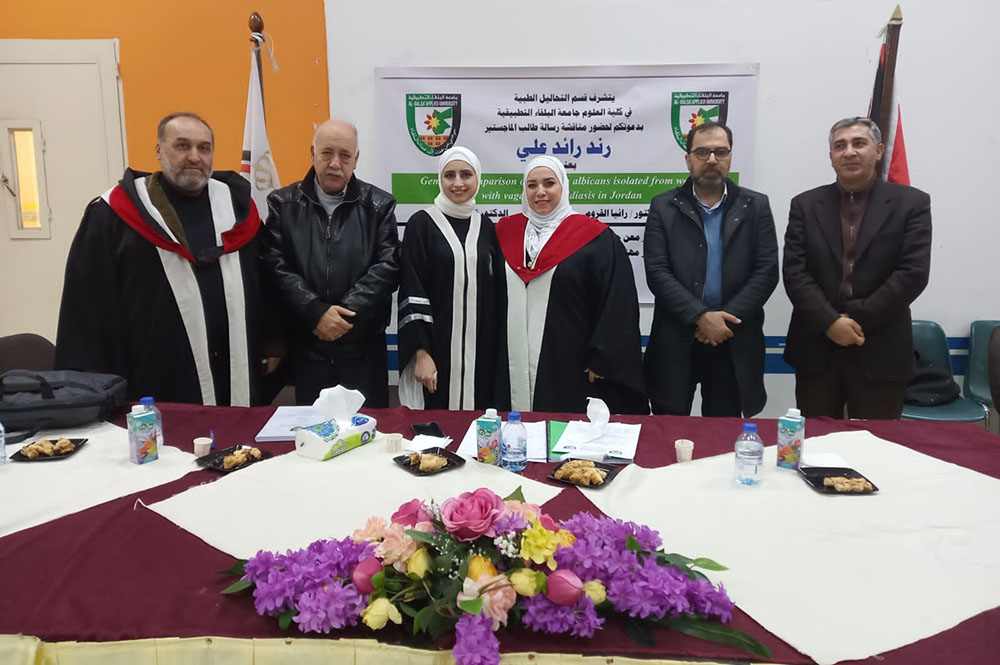 ضمن الاجراءات الاكاديمية المعتمدة في كلية العلوم جامعة البلقاء التطبيقية/ السلط للحصول على شهادة الماجستير تمت يوم الاربعاء الموافق 11/1/2023 مناقشة رسالة ماجستير في تخصص التحاليل الطبية والتي تقدمت بها الطالبة رند رائد محمود علي بعنوان: