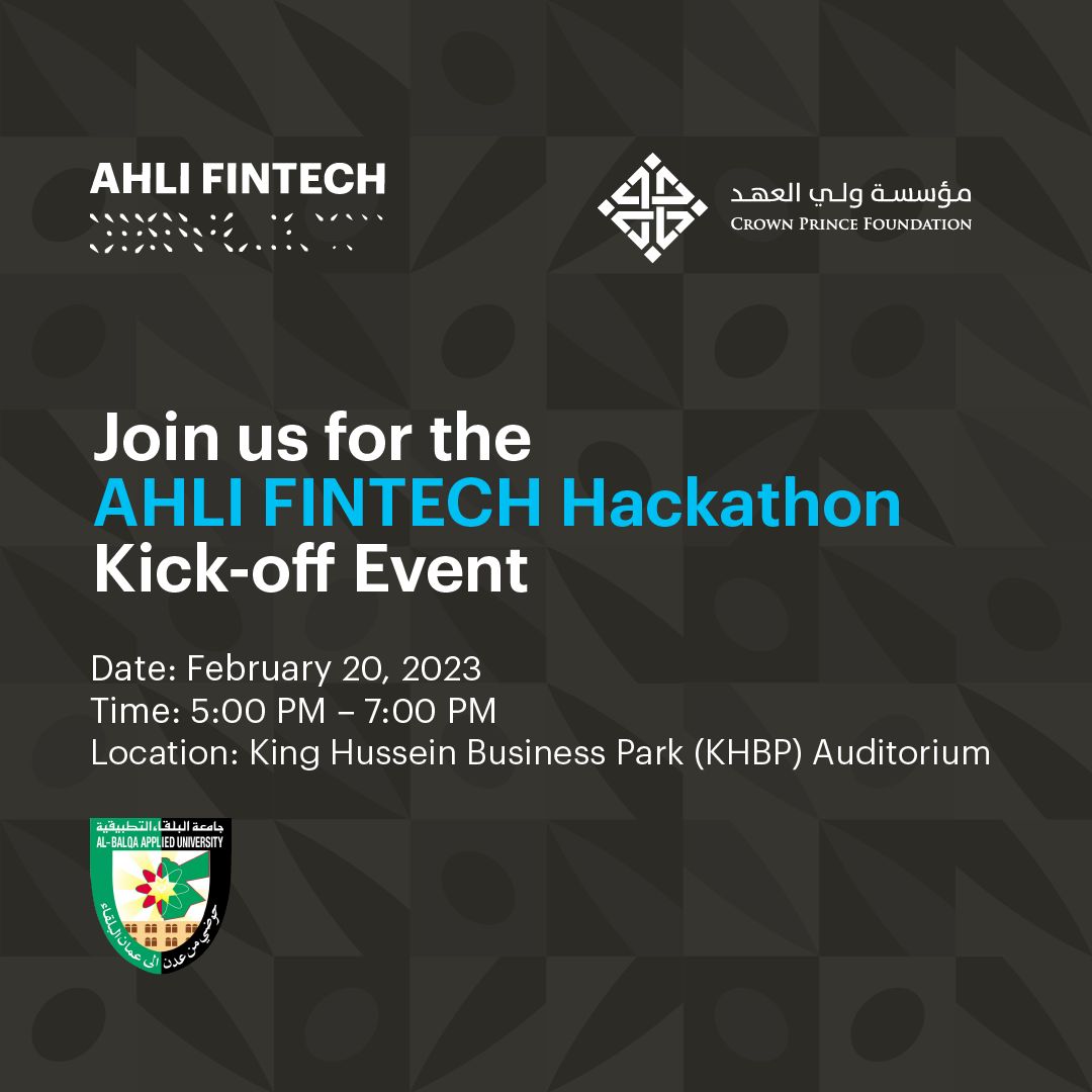 بالتعاون و التنسيق مع مركز الابداع و الابتكار و ريادة الأعمال في عمادة البحث العلمي و الابتكار سيتم إطلاق " الأهلي فنتك" هكاثون التكنولوجيا المالية ( رالي الحلول الرقمية في القطاع المصرفي و المالي) بالشراكة مع مؤسسة ولي العهد، و ذلك يوم الإثنين الموافق 20/2/2023 من الساعة 5-7 مساءاً، في مجمع الملك الحسين للأعمال
