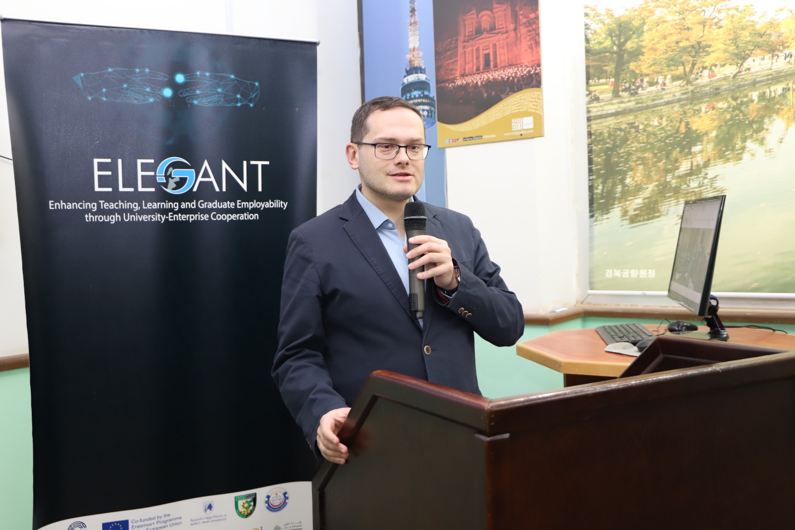من جهته رحب الاستاذ الدكتور طارق العزب مدير المشروع بالمشاركين في الورشة و تمنى لهم إقامة سعيدة في الاردن، مشيرا الى ان مشروع ELEGANT قد بدأ في عام ال ???? وتم خلاله تدريب مجموعة كبيرة من أعضاء هيئة التدريس في الدول المشاركة في المشروع، دورتين في كرواتيا و وأربعه دورات في ايطاليا و ثلاث دورات في بريطانيا و ورشتين في لبنان بالإضافة الى الورشات المحلية في جامعة البلقاء التطبيقية و جامعة الاميرة سمية للتكنولوجيا و جامعة العلوم و التكنولوجيا.