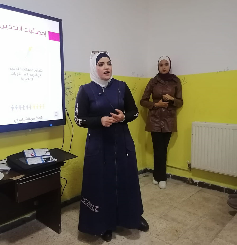 حيث تحدثت السيدة فوزية خريسات عن التدخين وأشكاله ومكونات السجائر التي تحتوي على الكثير من المواد السامه كما تحدثت عن الاثار السلبية للتدخين على الفرد والمجتمع من النواحي الصحية والاجتماعية والاقتصادية، كما تطرقت للاحصائيات العالمية بخصوص التدخين.