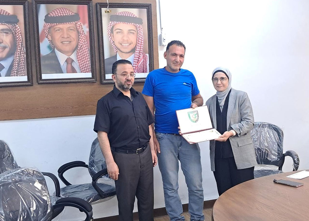 سلمت عميدة كلية إربد الجامعية الأستاذة الدكتورة مريم فريحات شهادة الموظف المثالي عن شهر حزيران للزميل مصطفى أحمد عبد القادر تقديرًا لجهوده المتميزة في العمل.