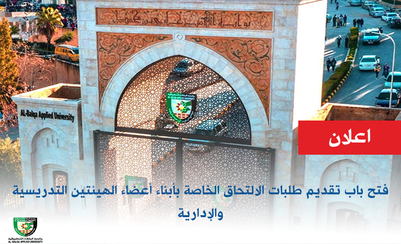 يعلن المسجل العام في جامعة البلقاء التطبيقية عن تفعيل بوابة القبول الالكترونية في كليات الجامعة للفصل الدراسي الأول 2023-2024 فعلى جميع الطلبة الراغبين بتقديم طلبات التحاق بجميع التخصصات المطروحة لمرحلة البكالوريوس (الثانوية العامة، التجسير/ الموازي) وجميع التخصصات المطروحة لمرحلة الدبلوم المتوسط في جميع كليات الجامعة، وذلك من خلال الاطلاع على الدليل الاسترشادي والموجود على موقع الجامعة الالكتروني / بوابة القبولات / بوابة طلبات التحاق أبناء العاملين في الجامعة لتقديم طلب الالتحاق ، وذلك اعتبارا من صباح يوم الأحد الموافق 20-8-2023، وحتى نهاية دوام يوم الاحد الموافق 3-9-2023.