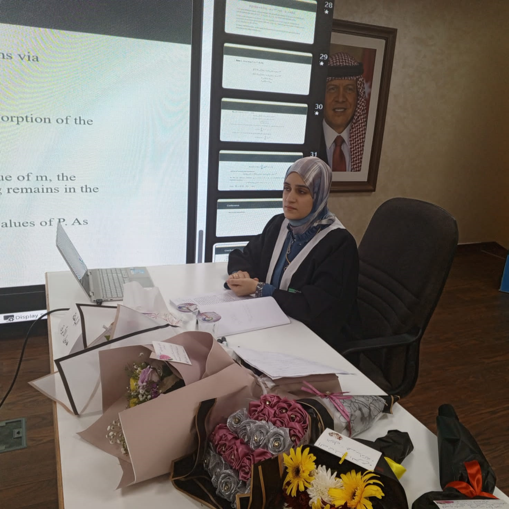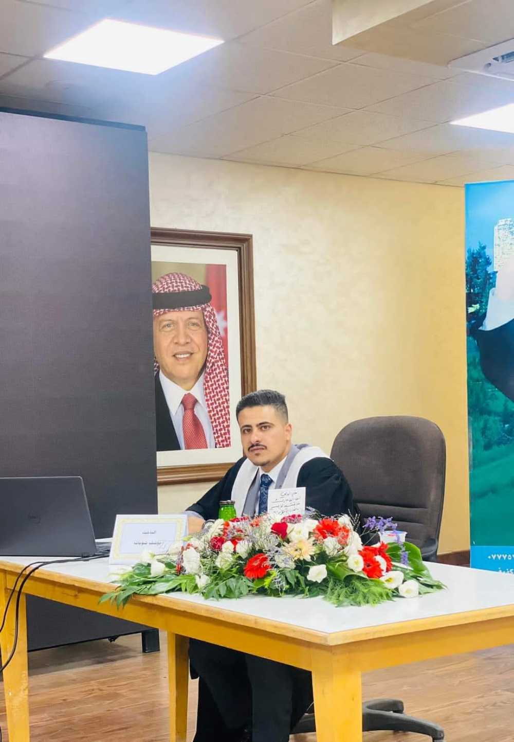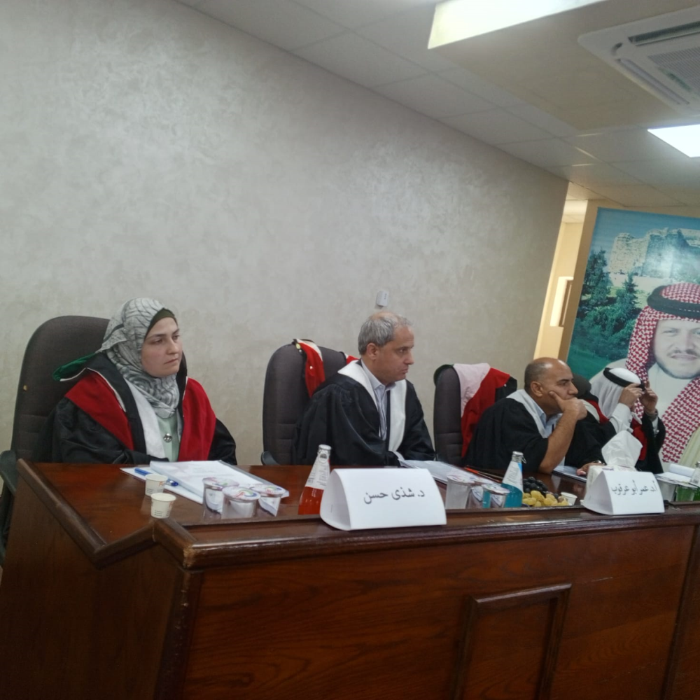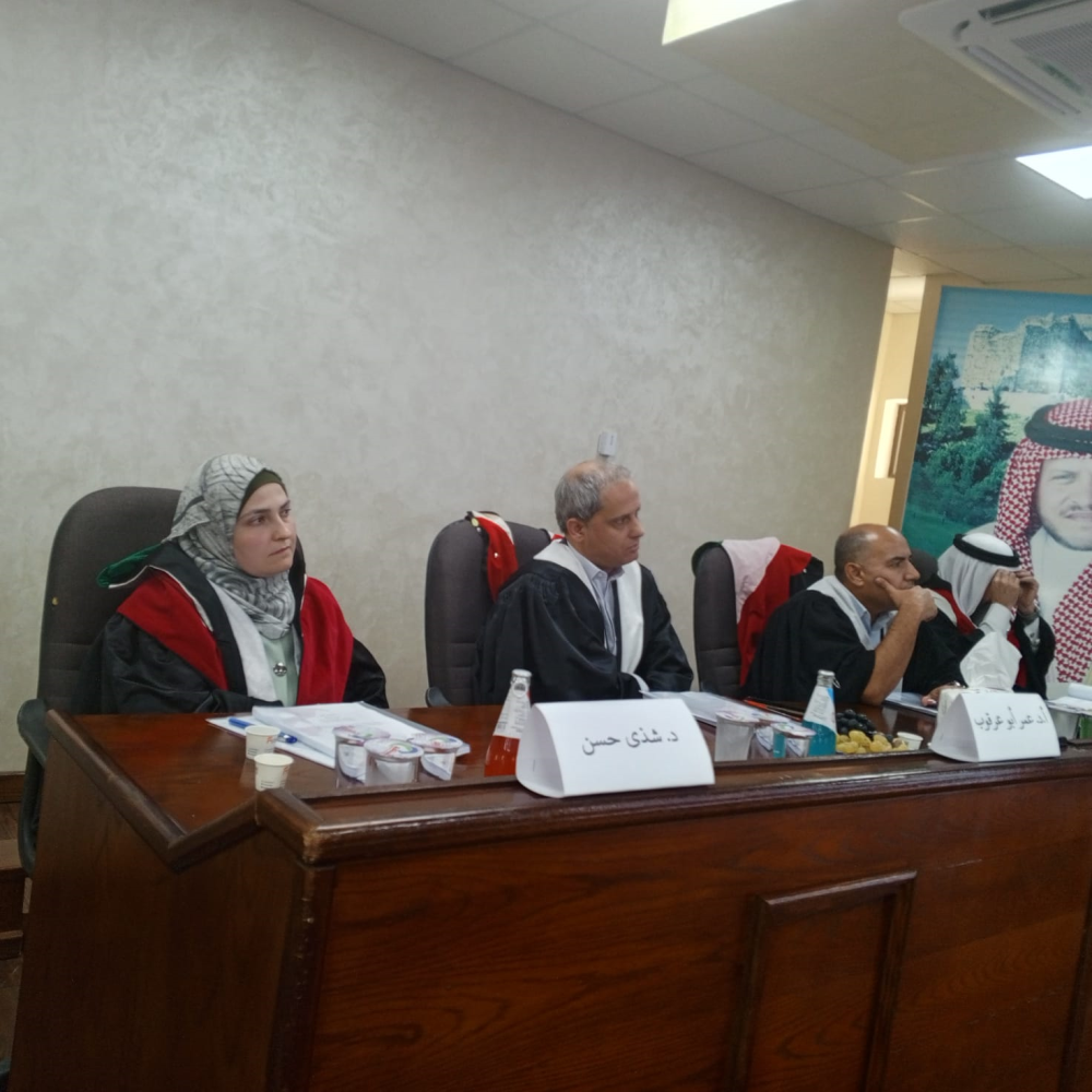 و تشكلت لجنة المناقشة برئاسة وإشراف الدكتورة شذى حسن من كلية عجلون الجامعية والدكتور أسعد فريحات مناقشاً داخلياً / كلية عجلون الجامعية والاستاذ الدكتور عمر ابو عرقوب مناقشاً داخلياً / كلية السلط /جامعة البلقاء التطبيقية والاستاذ الدكتور محمد زريقات مناقشاً خارجياً / جامعة آل البيت.