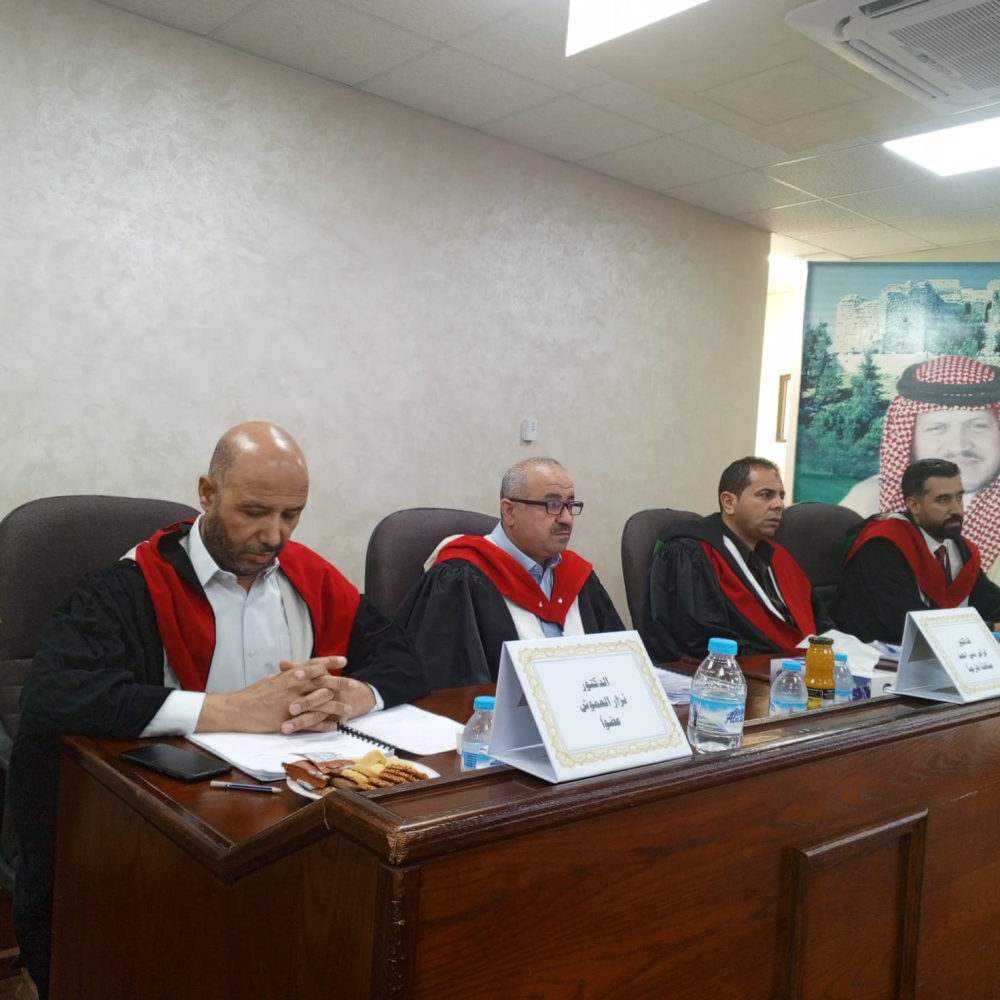 و تشكلت لجنة المناقشة برئاسة وإشراف الدكتور محمد الخلايلة من كلية عجلون الجامعية والأستاذ الدكتور مراد مساعده مناقشاً داخلياً / كلية عجلون الجامعية و الدكتور نزار العشوش مناقشاً داخلياً / كلية السلط /جامعة البلقاء التطبيقية والدكتور فراس بني أحمد مناقشاً خارجياً / الجامعه الهاشمية.
