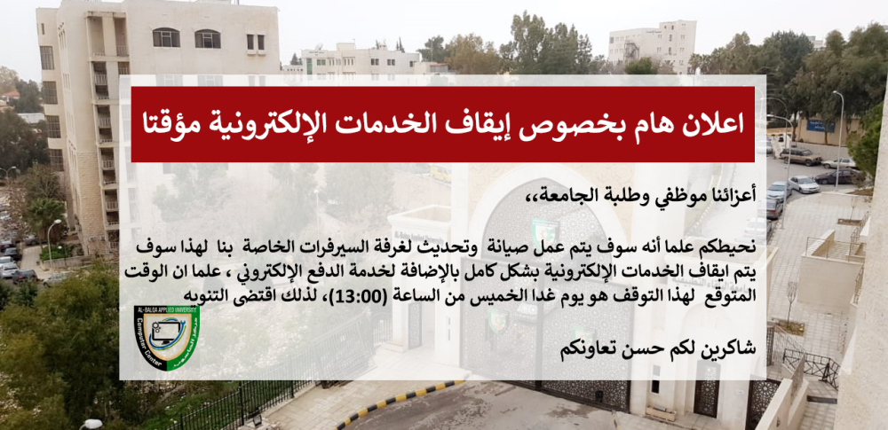 نحيطكم علما أنه سوف يتم عمل صيانة وتحديث لغرفة السيرفرات الخاصة بنا لهذا سوف يتم ايقاف الخدمات الإلكترونية بشكل كامل بالإضافة لخدمة الدفع الإلكتروني ، علما ان الوقت المتوقع لهذا التوقف هو يوم غدا الخميس من الساعة (13:00)، لذلك اقتضى التنويه