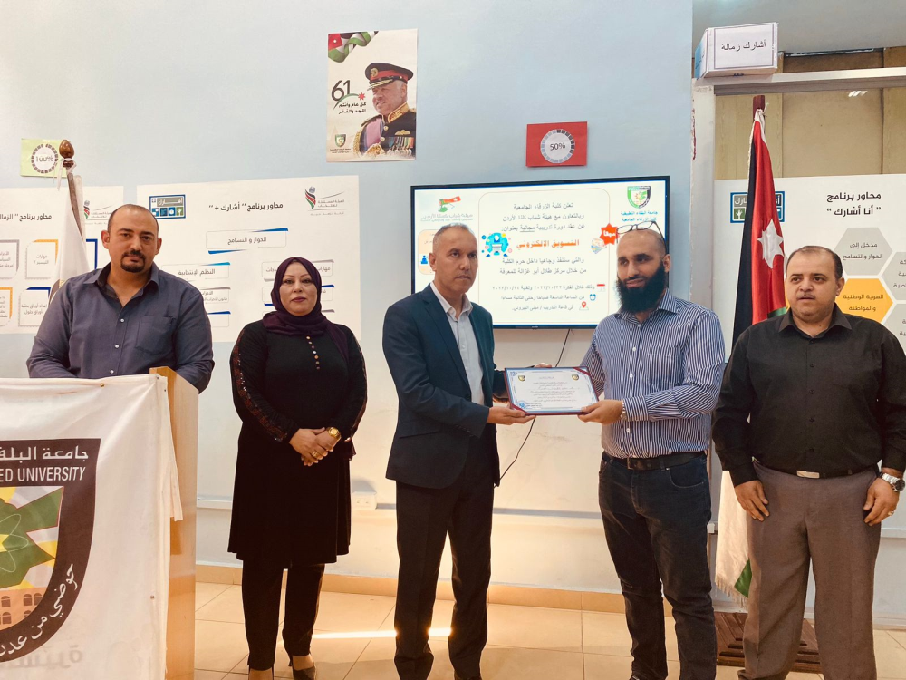 تعزيزا للشراكة المستمرة والدور الذي تقوم به كلية الزرقاء الجامعية / جامعة البلقاء التطبيقية وضمن خطة الجامعة للتفاعل مع المجتمع المحلي في الأنشطة المنهجية واللامنهجية،رعى الأستاذ الدكتور زيد سليمان العدوان عميد الكلية تخريج دورة "التسويق الالكتروني" ، وبحضور الدكتور صلاح الصالح مساعد العميد للتطوير والتدريب والجودة ، حيث عقدت الدورة بالتعاون مع هيئة شباب كلنا الأردن / الزرقاء ونفذت من خلال مجتمع طلال أبو غزالة للمعرفة وبتنظيم وتنسيق قسمي ضمان الجودة والعلاقات العامة وخدمة المجتمع المحلي.