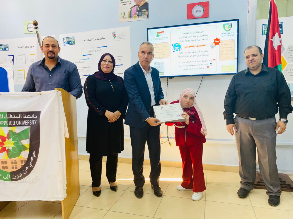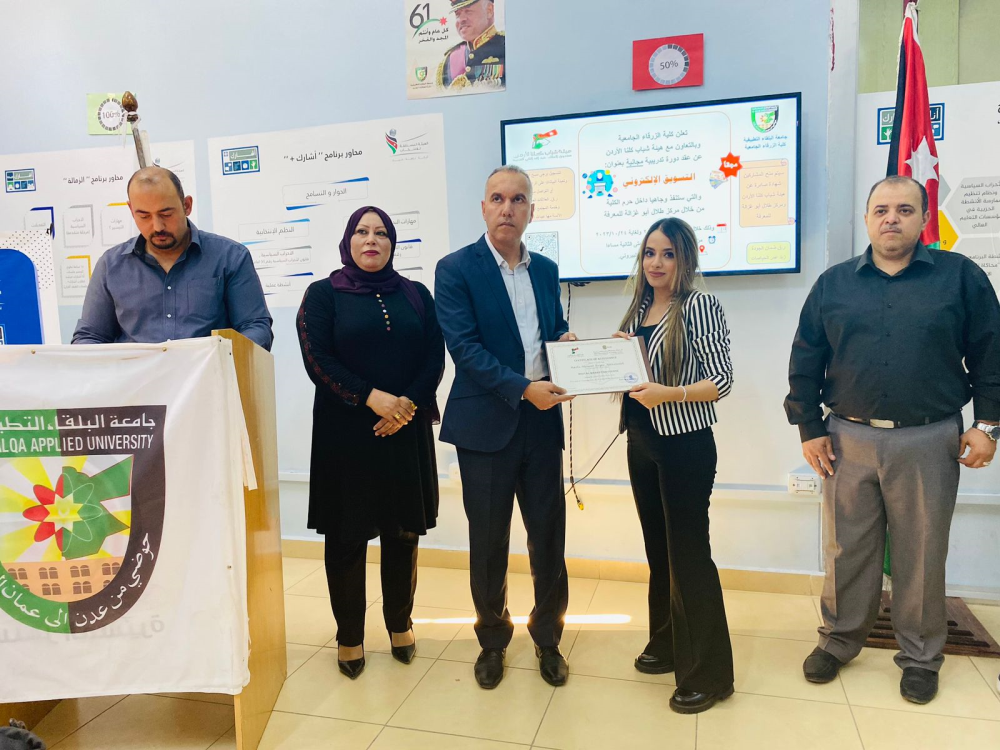 وفي ختام الدورة قام عميد الكلية بتسليم شهادات شكر وتقدير لكل من مدرب الدورة ومنسق هيئة شباب كلنا الأردن السيد سمير فاخوري ، والذي أشاد بدور الكلية في السعي المستمر لتنمية مهارات الطلبة والمجتمع المحلي، كما تم تسليم الشهادات للطلبة الذين استكملوا البرنامج التدريبي ضمن المعايير الخاصة بالبرنامج وعددهم (35 طالب) موزعين بين طلبة من الكلية و المجتمع المحلي.