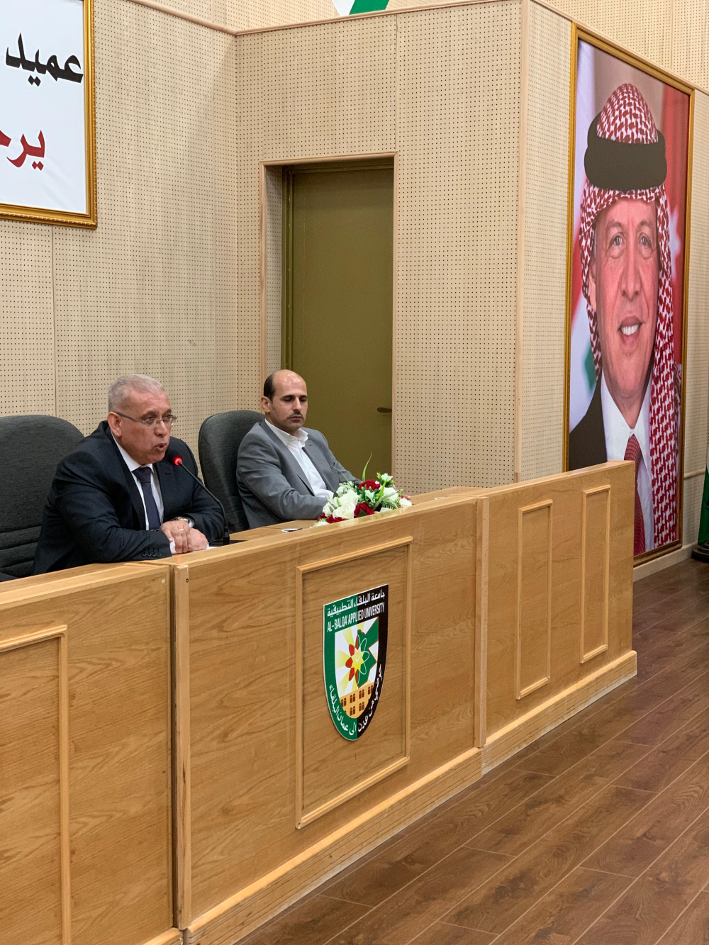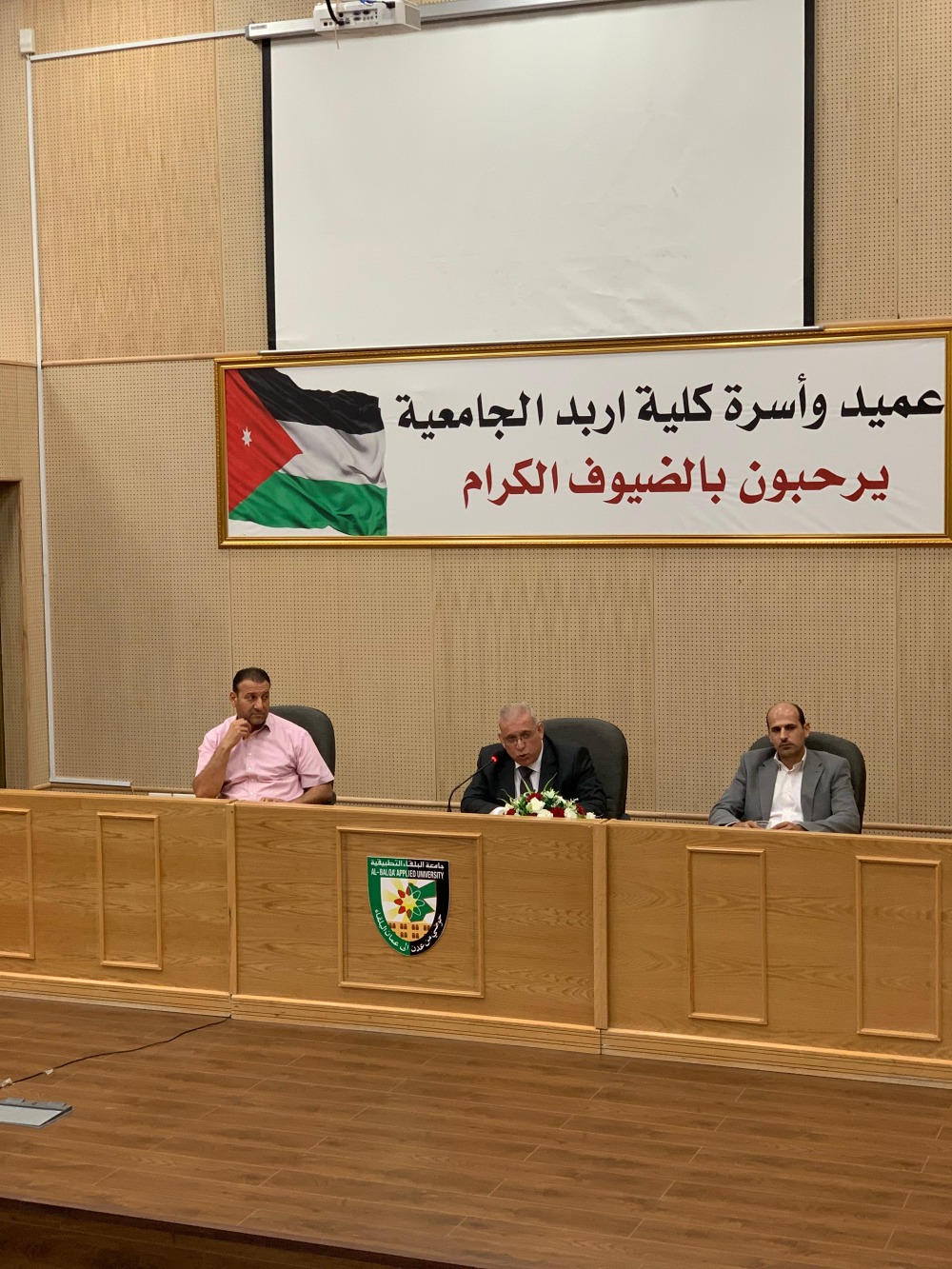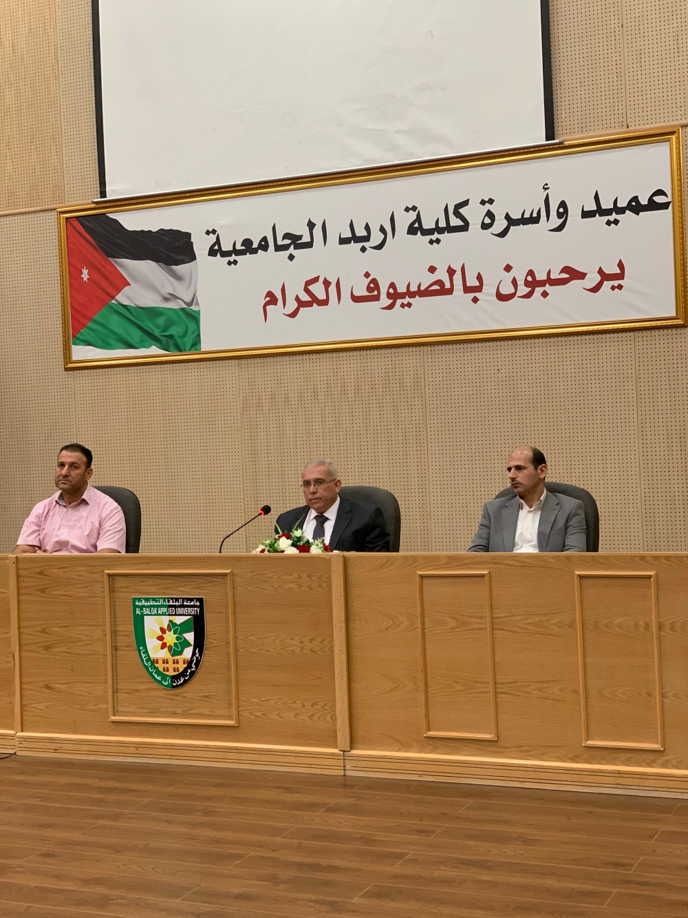وفي بداية اللقاء رحب عميد الكلية بالطلبة المستجدين ،ومباركاً لهم قبولهم في الكلية، وانضمامهم لها كصرح علمي متميز ، متمنيا أن يكونوا سفراء لها بعد تخرجهم، كمانقل عميد الكلية للطلبة تحيات عطوفة رئيس الجامعة الأستاذ الدكتور أحمد فخري العجلوني ، مؤكداً في بداية اللقاء على توجهات جامعة البلقاء التطبيقية المستمرة لتطوير كليات الجامعة والتخصصات الموجودة فيها وأن جامعة البلقاء التطبيقية تمثل قصة نجاح حريّ بنا جميعا أن نفتخر ونعتز بها.