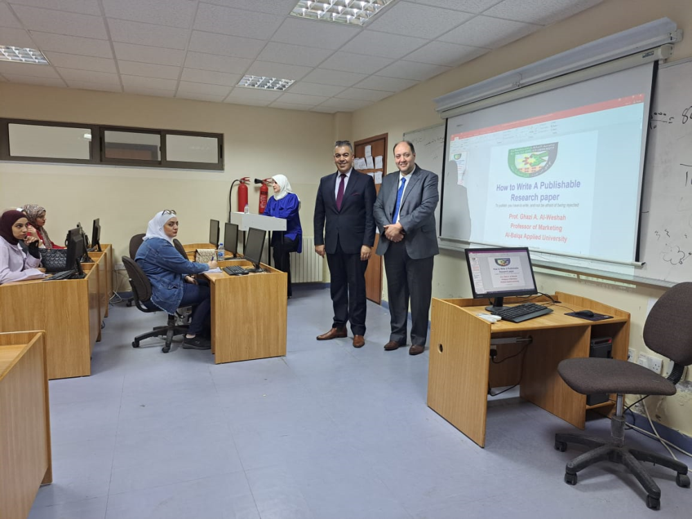 قامت كلية الاعمال بحضور عميد كلية الاعمال الدكتور محمد النسور بعقد ورشة علمية بعنوان "اعداد الورقة العلمية" قدمها الاستاذ الدكتور غازي الوشاح؛ حضرها عددا من أعضاء الهيئة التدريسية وطلبة الماجستير من مختلف التخصصات في كلية الاعمال.