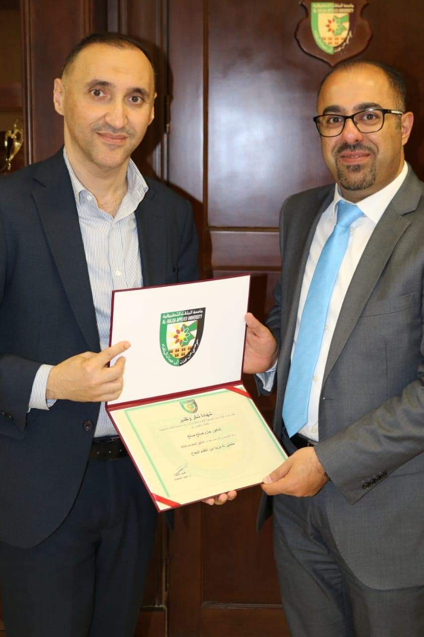 وفي نهاية الورشه كرم عميد الكلية الاستاذ الدكتور احمد الدحيات المدرب الدكتور حازم صالح