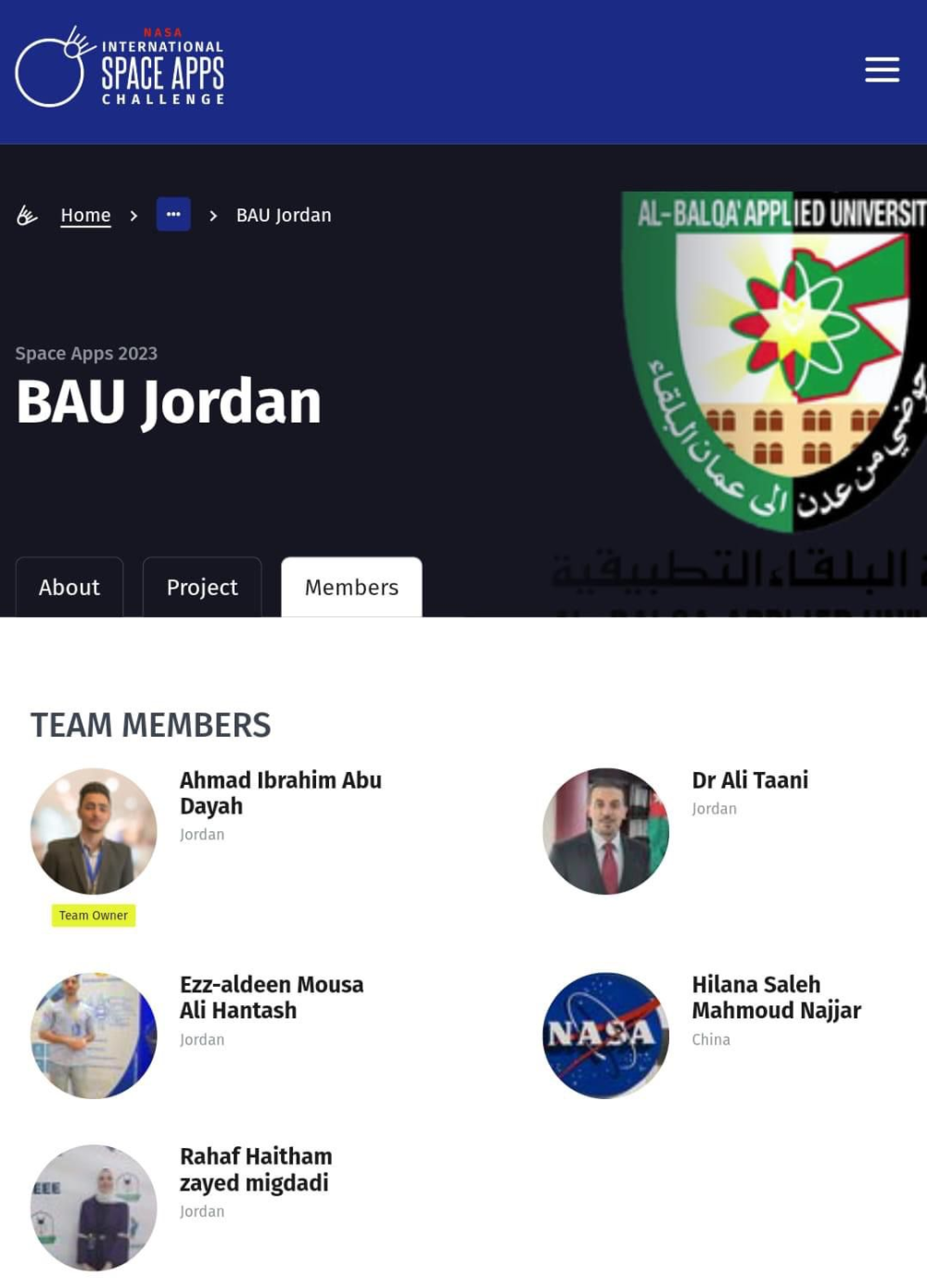 وتشكل فريق جامعة البلقاء التطبيقية (BAU Jordan) من : د. علي الطعاني: تخصص الفيزياء الفلكية ورئيس قسم الفيزياء في الجامعة.، م. أحمد أبو دية: هندسة الميكاترونكس.، م. عز الدين هنطش: هندسة الطاقة الكهربائية،• م. هيلانة النجار: ماجستير هندسة تكنولوجيا الفضاء، بالاضافة الى م. رهف مقدادي: هندسة الالكترونيات.
