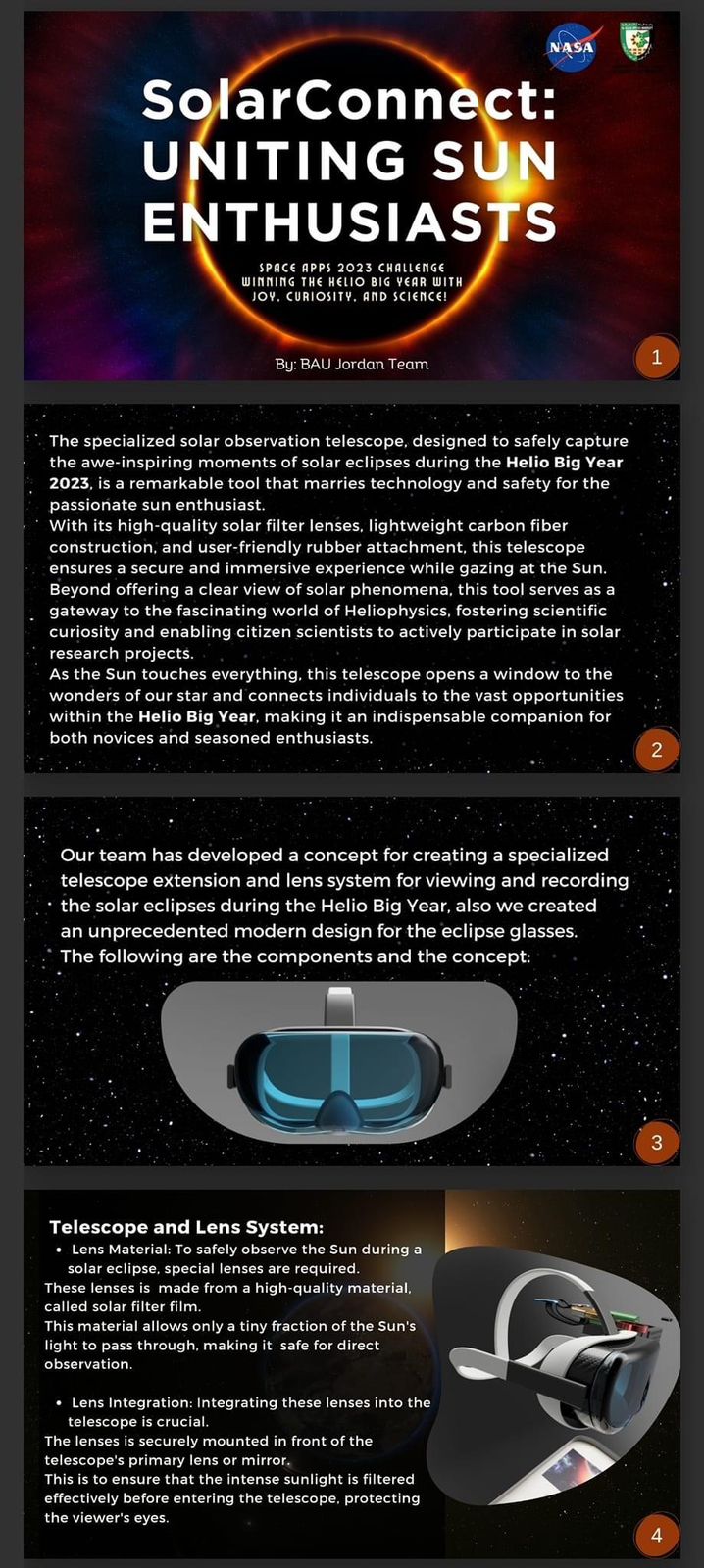 ويتمحور المشروع على جزئين مبتكرين لتحسين تجربة هواة الفلك في رحلاتهم الاستكشافية، حيث يتضمن الجزء الأول تصميمًا عصريًا وفريدًا من نوعه لنظارة خاصة، تحمي العيون من إشعاعات الكسوف وتمكّن المشاهدين من رصد الظواهر الشمسية بزاوية رؤية واسعة وبشكل مباشر مع حماية كاملة للعين.