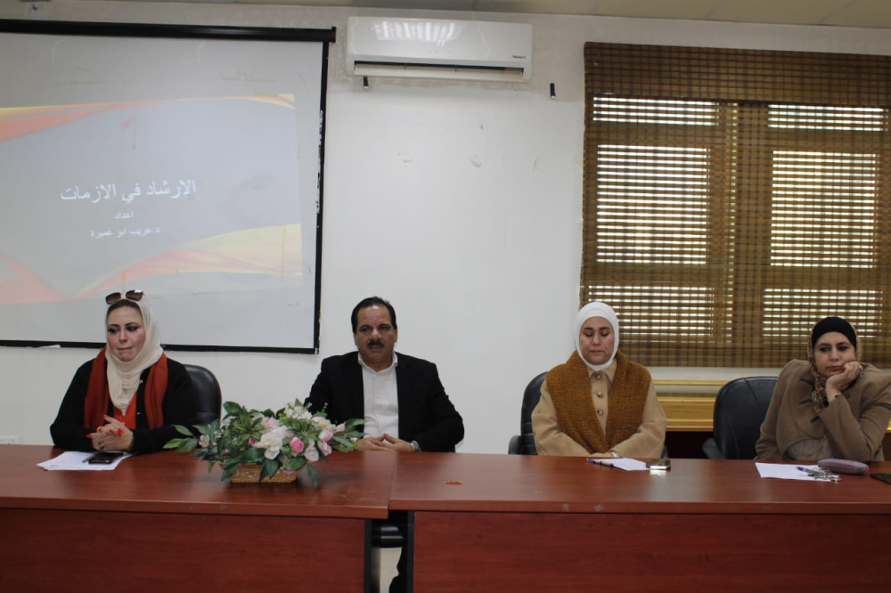 تتضمن المبادرة محاضرة بعنوان (الارشاد في الازمات ) للدكتورة عريب أبوعميرة حيث بدأت المحاضرة بقراءة الفاتحة على أرواح الشهداء في غزة فكلمة لعميد الكلية الأستاذ الدكتور ناجي السعايدة أوضح فيها موقف الأردن الثابت المتمثلة بمواقف جلالة الملك عبدالله الثاني ابن الحسين المعظم منذ بداية العدوان على غزة وجهوده الحثيثة وحراكه المستمر بوقف هذا العدوان الغاشم وأن حل الدولتين هو السبيل الوحيد لحل النزاع الفلسطيني الإسرائيلي، مؤكدا ضرورة انصياع الجانب الإسرائيلي لقرارات الشرعية الدولية، وإعطاء الشعب الفلسطيني حقه المشروع في دولة مستقلة ذات سيادة على حدود الرابع من حزيران1967.