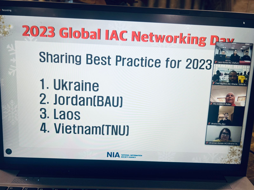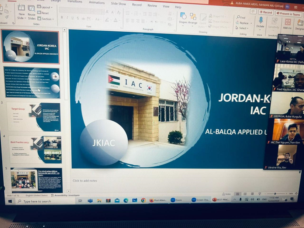 شارك المركز الأردني الكوري للمعلومات وتكنولوجيا الاتصالات باجتماع يوم التواصل العالمي لمراكز الوصول للمعلومات IAC، عن بعد عبر تقنية Zoom, وذلك يوم الجمعة الموافق 2023/12/22 الساعة 11:00 صباحاً بتوقيت الأردن، حيثُ تم مشاركة الأمثلة البارزة للتعليم والمشاريع على مدار العام ، وتم اختيار المركز الأردني الكوري كافضل مثال لتنظيم وعقد دورات تستهدف طلبة المدارس من خلال عقده دورات في الروبوتات ولغة البرمجة بايثون.
