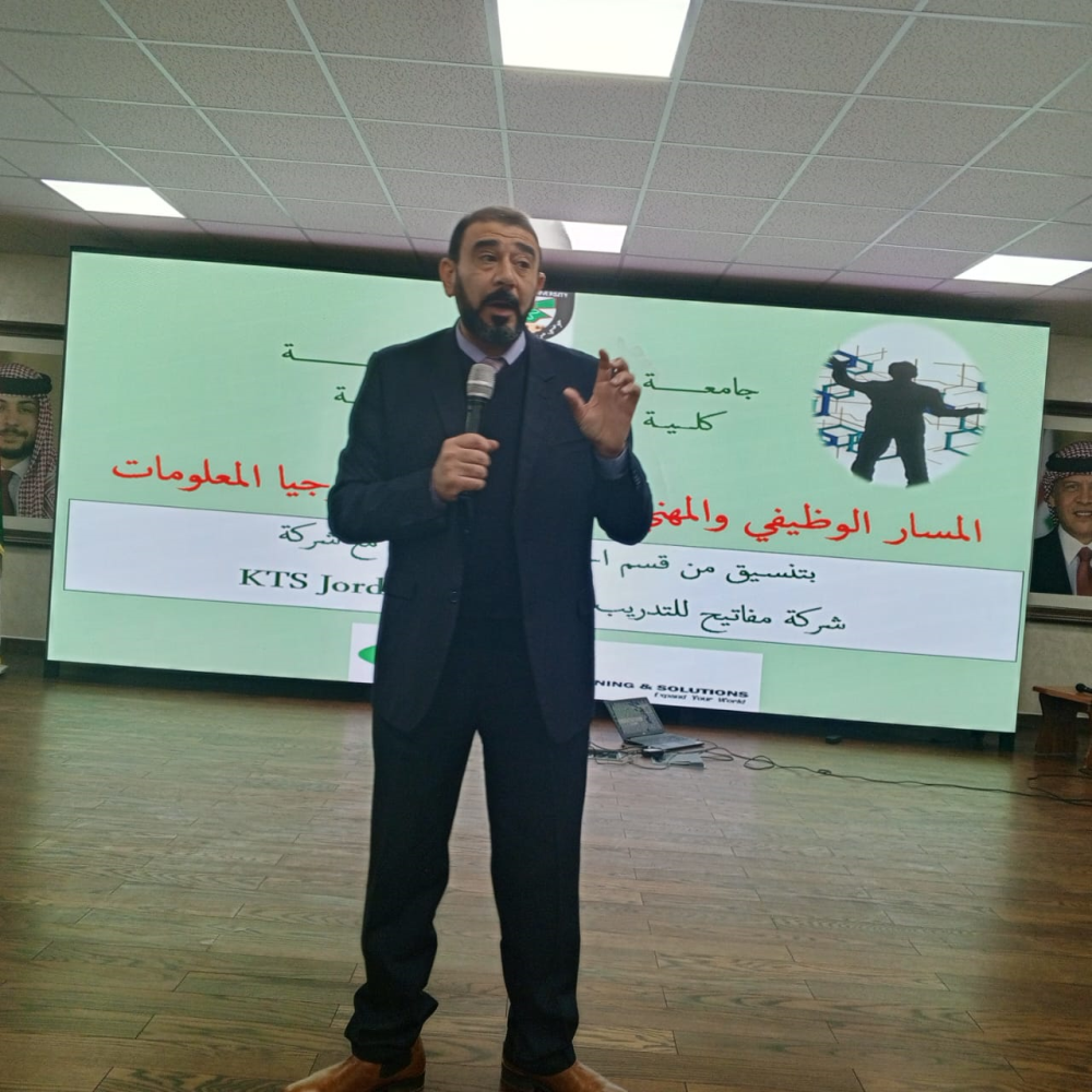 محاضرة تثقيفية بعنوان " المسار الوظيفي والمهني لتخصصات تكنولوجيا المعلومات" بحضور عميد الكلية الأستاذ الدكتور وائل الربضي وعدد من أعضاء الهيئتين الأكاديمية والإدارية وطلبة الكلية.