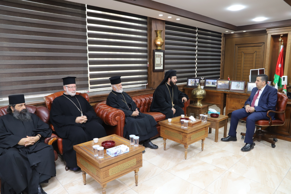 استقبل رئيس جامعة البلقاء التطبيقية الأستاذ الدكتور احمد فخري العجلوني في مكتبه الرئيس الروحي للكنيسة الأرثوذكسية لمحافظة البلقاء الارشمندريت خريستوفوروس حداد، يرافقه الأب الايكونوموس جبرائيل( مروان) طعامنة كاهن رعية السلط والأب الايكونوموس رومانوس سماوي كاهن رعية الفحيص والشماس بايسيوس مدانات، بحضور الأساتذة نواب رئيس الجامعة