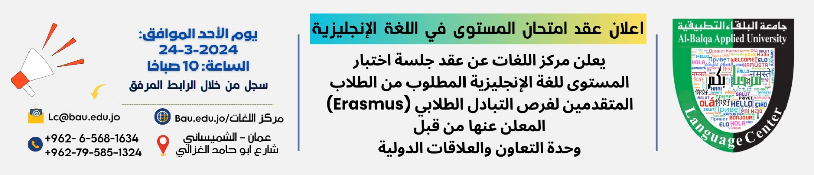 يعلن مركز اللغات عن عقد جلسة اختبار المستوى للغة الإنجليزية المطلوب من الطلاب المتقدمين لفرص التبادل الطلابي (Erasmus) المعلن عنها من قبل وحدة التعاون والعلاقات الدولية.