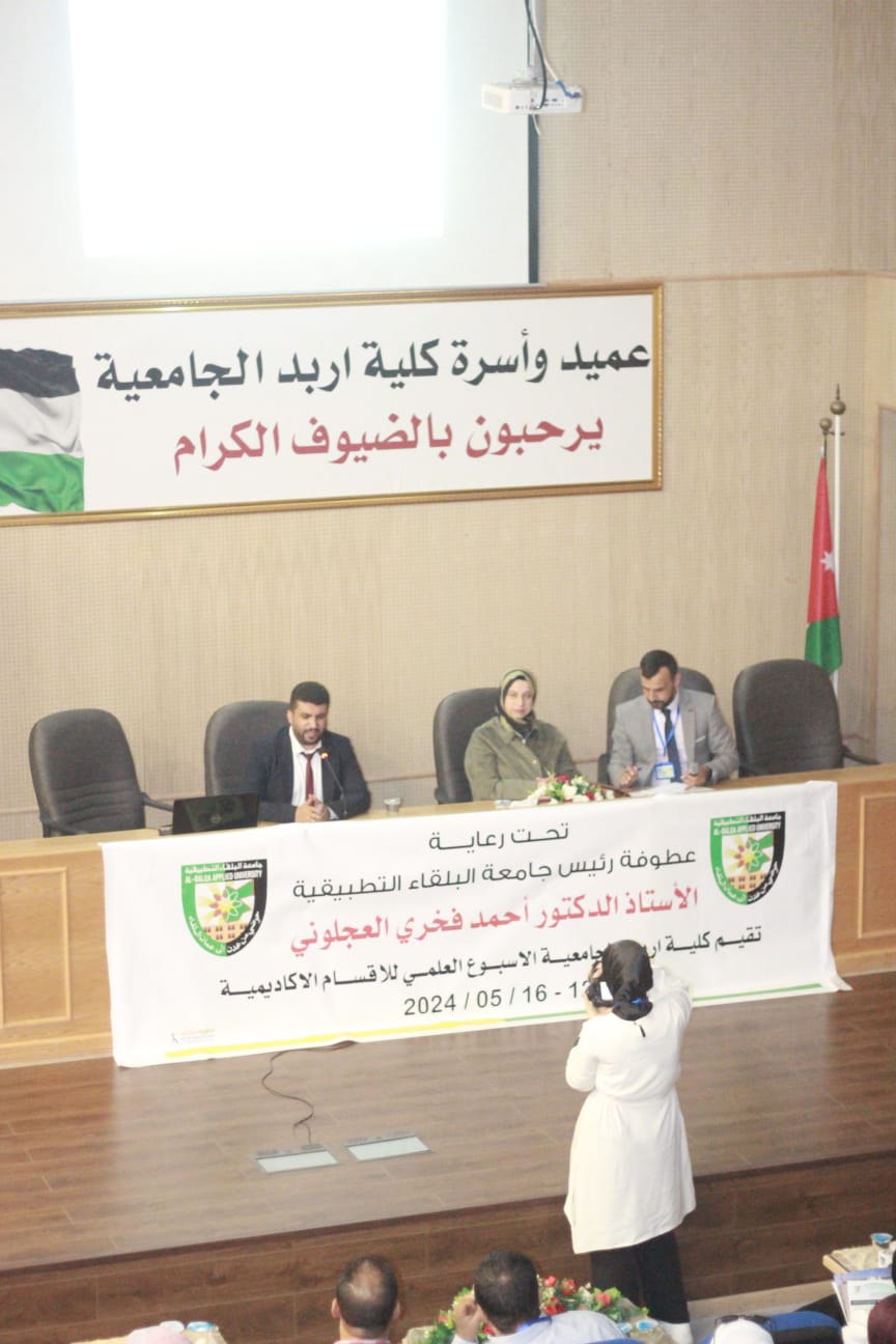 وافتتح في اليوم الأول للأسبوع العلمي اليوم الأكاديمي لقسم العلوم التطبيقية الصحية في الكلية تحت شعار "معًا لتعزيز الوعي الصحي" وفي البداية رحبت الدكتورة دانيا أبو ناصر رئيسة القسم بالمشاركين وشكرت عطوفة رئيس الجامعة وعميد الكلية على دعم ورعاية فعاليات اليوم العلمي.