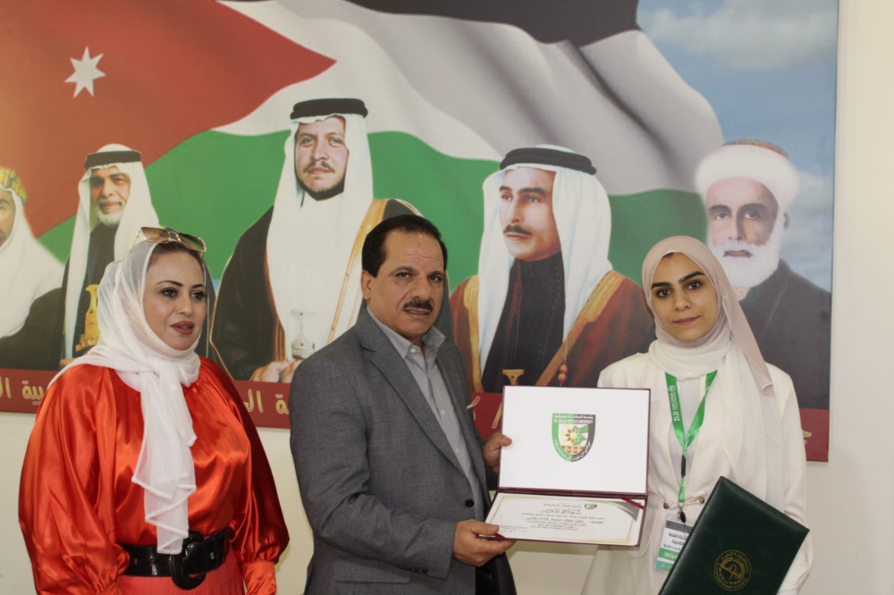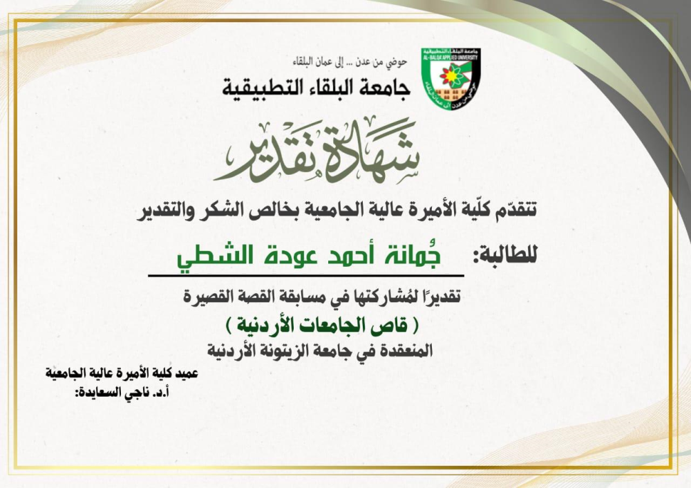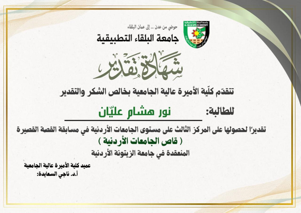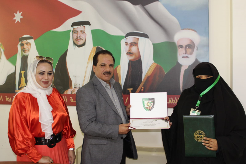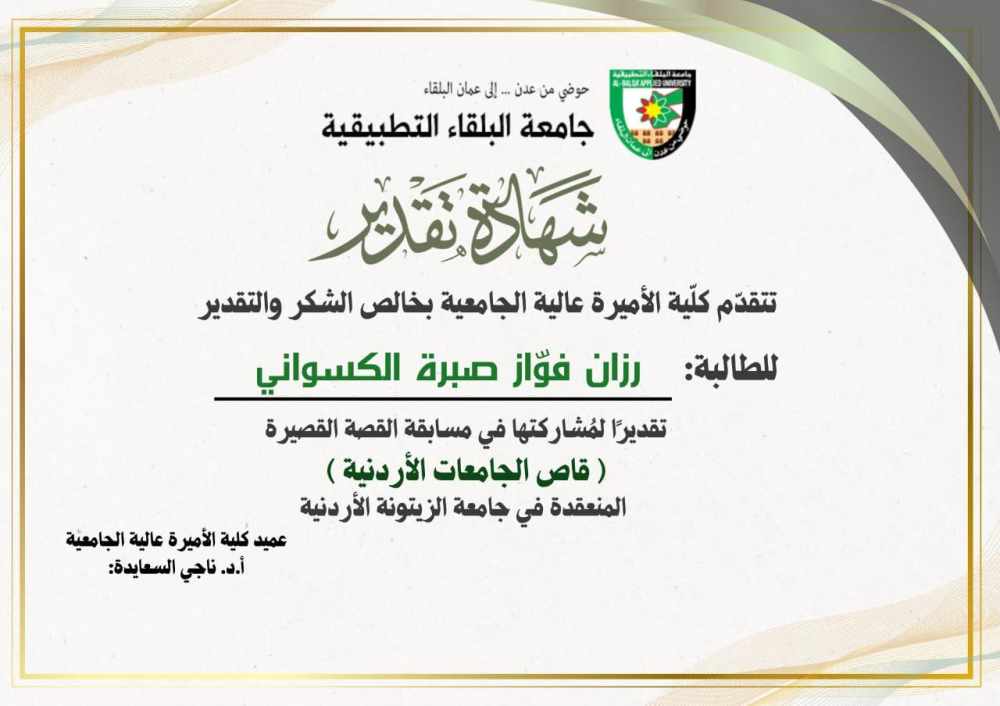 إنطلاقاً من دور جامعة البلقاء التطبيقية/كلية الأميرة عالية الجامعية الريادي في تشجيع الأنشطة اللامنهجية و الإبداعية للارتقاء بشخصية الطالب الجامعي للمشاركة الفاعلة في بناء المجتمع كرّم عميد كلية الأميرة عالية الجامعية الأستاذ الدكتور ناجي السعايدة وبالتنسيق مع مساعد العميد للشؤون الطلابية الطالبة الفائزة بالمركز الثالث والطالبات المشاركات في المسابقة المنعقدة في جامعة الزيتونة الاردنية "قاص الجامعات الاردنية 2024 والموسومة بعنوان "أطفال غزة بين الحصار و الحرب" وهن: