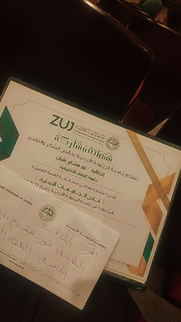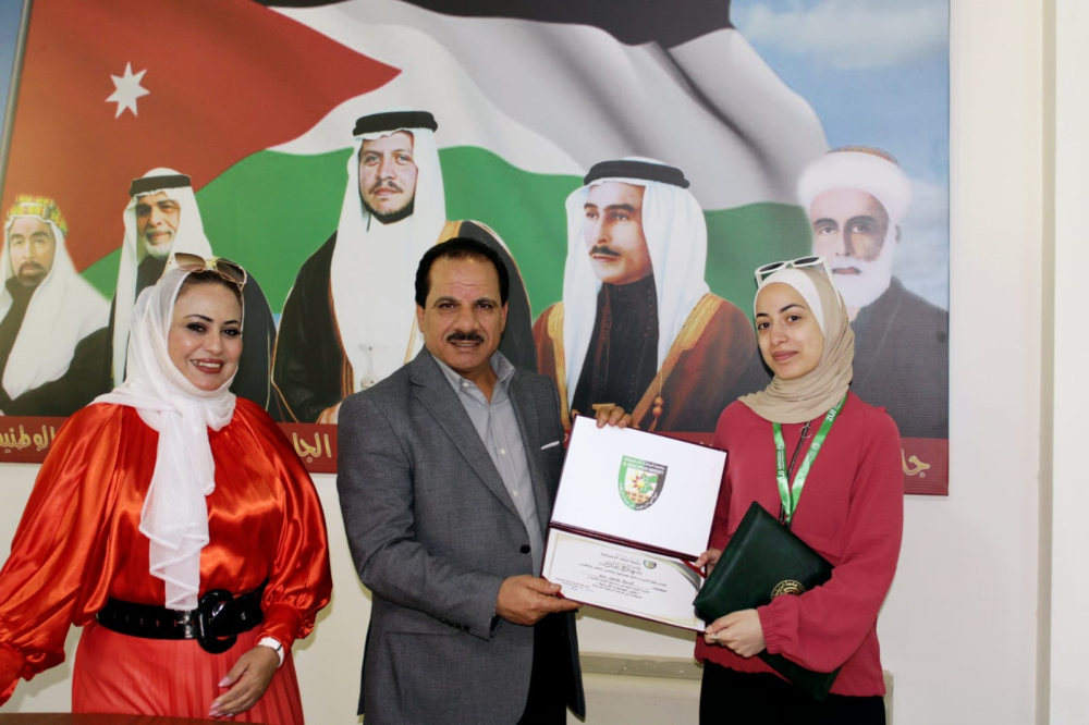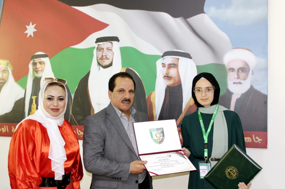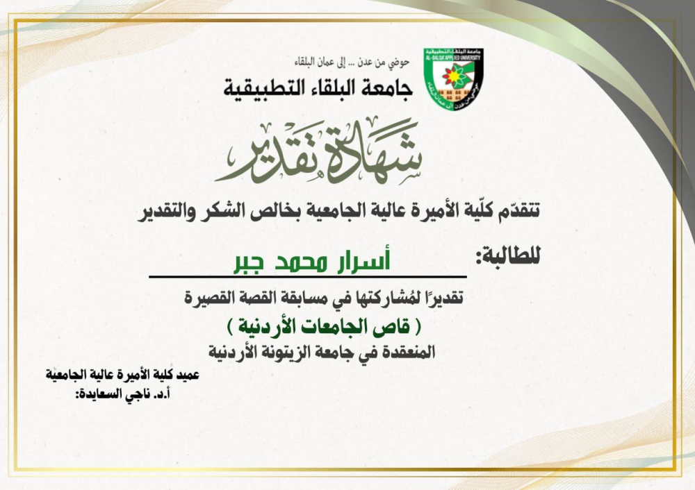 إنطلاقاً من دور جامعة البلقاء التطبيقية/كلية الأميرة عالية الجامعية الريادي في تشجيع الأنشطة اللامنهجية و الإبداعية للارتقاء بشخصية الطالب الجامعي للمشاركة الفاعلة في بناء المجتمع كرّم عميد كلية الأميرة عالية الجامعية الأستاذ الدكتور ناجي السعايدة وبالتنسيق مع مساعد العميد للشؤون الطلابية الطالبة الفائزة بالمركز الثالث والطالبات المشاركات في المسابقة المنعقدة في جامعة الزيتونة الاردنية "قاص الجامعات الاردنية 2024 والموسومة بعنوان "أطفال غزة بين الحصار و الحرب" وهن: