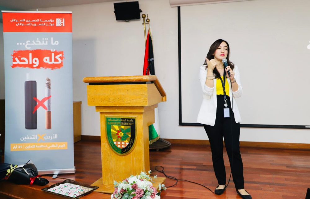 بدوره أعرب الدكتور أحمد الحوامدة والسيدة روان شهاب من مؤسسة الحسين للسرطان عن شكرهم لجامعة البلقاء التطبيقية لمشاركتها مؤسسة الحسين للسرطان في تنظيم هذه الفعالية حيث تلعب الجامعات دورًا حيويًا في مكافحة التدخين من خلال توفير بيئة صحية وتثقيفية للطلاب وأفراد المجتمع الأكاديمي، ويمكن للجامعات تنظيم حملات توعية، وتقديم برامج الإقلاع عن التدخين، وتشجيع الأبحاث حول آثار التدخين، بالتعاون مع الطلاب والموظفين، يمكن للجامعات تعزيز ثقافة مضادة للتدخين وتشجيع السلوك الصحي في مجتمعاتها